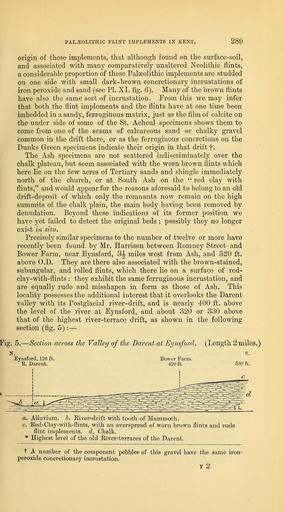 | Keywords: The Quarterly journal of the Geological Society of London (13937160882).jpg PALEOLITHIC FLINT IMPLEMENTS IN KENT 291 <br> affords however better evidence of glacial action This gravel which <br> consists in greater part of perfectly angular and unrolled white flints <br> with a few Tertiary pebbles and occasionally with fragments of chert <br> is unstratified and looks as though it had been forced down irregu- <br> larly as it were into the underlying Gault by pressure from above <br> The flints are often pitted or pock-marked The section however <br> at Park-Farm brick-pit is small and insufficient This gravel is <br> better developed and possesses more distinctive characters in other <br> parts of the Holmesdale valley and I will therefore reserve the fuller <br> account of it to a future occasion when I shall be able to give more <br> definite reasons for its origin <br> I showed many years ago that the great trough or valley of <br> Holmesdale in which this drift has been deposited is of more <br> recent date than the extensive spread of red clay with flints <br> which lies on the top of the chalk hills Consequently the brown- <br> stained flint- drift which has now been traced to the edge of the <br> escarpment where like the red clay it suddenly ends together <br> probably with the associated rude flint implements must also be of <br> older date than the valley and therefore anterior to the Postglacial <br> river-drifts of these tributaries of the Medway and the Thames <br> valleys which lie in them I have also shown f that there has been <br> at a time probably before that of the northern drift or Boulder-clay <br> series a drift from the south which carried the chert and ragstone of <br> the Lower Greensand across the chalk-escarpment into the Thames <br> valley ” not in the line of the present river-valleys but traversing <br> the high chalk plain and capping the summit of some of the higher <br> hills in the London basin Still it seems not to be universally <br> distributed but to keep to certain lines springing from the lower <br> but still high points or gaps in the chalk-escarpment J Amongst <br> the drift-capped hills of the Thames valley is that of Swanscombe <br> Wood 51 miles north of Ash and 306 ft § above J It consists <br> of an outlier of London Clay with a capping of this southern drift <br> which there consists according to a note I made some years ago <br> of a small shallow section then existing by the Old Telegraph of ” <br> Tertiary flint pebbles Woolwich beds <br> Subangular fragments of brown chert 1 <br> ž ž of bright red chert Lower Greensand <br> ž of yellow ragstone J <br> Subangular flints not coloured <br> Flints much rolled and worn and stained deep brown <br> Green-coated flints Thanet Sands <br> The above are placed in the order of their relative abundance <br> The brown and red cherts are from the Lower Greensand of the <br> On the Origin of the Sand and Gravel Pipes in the Chalk c Quart <br> Journ Geol Soc vol xi p 73 1854 <br> t Eeports Brit Assoc York 1881 p 621 <br> I Thus far this brown flint-drift appears to be generally associated with rude <br> flint implements ; but the inquiry is yet new and needs more extended obser- <br> vations <br> § This is 220 ft above the high-level terrace of implement-bearing river- <br> gravel at Swanscombe 36940084 113696 51125 Page 289 Text 45 http //www biodiversitylibrary org/page/36940084 1889 Geological Society of London Biodiversity Heritage Library The Quarterly journal of the Geological Society of London v 45 1889 Geology Periodicals Smithsonian Libraries bhl page 36940084 dc identifier http //biodiversitylibrary org/page/36940084 smithsonian libraries Information field Flickr posted date ISOdate 2014-04-21 Check categories 2015 August 26 CC-BY-2 0 BioDivLibrary https //flickr com/photos/61021753 N02/13937160882 2015-08-26 05 52 41 cc-by-2 0 PD-old-70-1923 The Quarterly journal of the Geological Society of London 1889 Photos uploaded from Flickr by Fæ using a script |