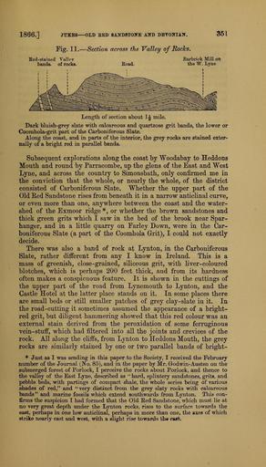 | Keywords: The Quarterly journal of the Geological Society of London (13935509061).jpg  1866 <br> JUKES OLD KED SAITDSTOXE AlfD DBTOIflAIf <br> 361 <br> Fig 11  Section across the Valley of Rocks <br> Eed-stained Valley <br> bands of rocks <br> Eoad <br> Barbrick Mill ott <br> theW Lyne <br> Length of section about 1- mile <br> Dark bluish-grey slate with calcareous and quartzose grit bands the lower or <br> Coomhola-grit part of the Carboniferous Slate <br> Along the coast and in parts of the interior the grey rocks are stained exter- <br> nally of a bright red in parallel bands <br> Subsequent explorations along the coast by Woodabay to Heddons <br> Mouth and round by Parracombe up the glens of the East and West <br> Lyne and across the country to Simonsbath only confirmed me in <br> the conviction that the whole or nearly the whole of the district <br> consisted of Carboniferous Slate Whether the upper part of the <br> Old Eed Sandstone rises from beneath it in a narrow antichnal curve <br> or even more than one anywhere between the coast and the water- <br> shed of the Exmoor ridge or whether the brown sandstones and <br> thick green grits which I saw in the bed of the brook near Spar- <br> hanger and in a little quarry on Farley Down were in the Car- <br> boniferous Slate a part of the Coomhola Grit I could not exactly <br> decide <br> There was also a band of rock at Lynton in the Carboniferous <br> Slate rather different from any I know in Ireland This is a <br> mass of greenish close-grained siliceous grit with liver-coloured <br> blotches which is perhaps 200 feet thick and from its hardness <br> often makes a conspicuous feature It is shown in the cuttings of <br> the upper part of the road from Lynemouth to Lynton and the <br> Castle Hotel at the latter place stands on it In some places there <br> are small beds or still smaller patches of grey clay-slate in it In <br> the road-cutting it sometimes assumed the appearance of a bright- <br> red grit but diligent hammering showed that this red colour was an <br> external stain derived from the peroxidation of some ferruginous <br> vein- stuff which had filtered into all the joints and crevices of the <br> rock All along the chifs from Lynton to Heddons Mouth the grey <br> rocks are similarly stained by one or two parallel bands of bright- <br> Just as I was sending in this paper to the Society I received the February <br> number of the Journal No 85 and in the paper by Mr Grodwin- Austen on the <br> submerged forest of Porlock I perceive the rocks about Porlock and thence to <br> the valley of the East Lyne described as -'hard splintery sandstones grits and <br> pebble beds with partings of compact shale the whole series being of various <br> shades of red and very distinct from the grey slaty rocks with calcareous <br> bands and marine fossils which extend southwards from Lynton This con- <br> firms the suspicion I had formed that the Old Eed Sandstone which must lie at <br> no very great depth under the Lynton rocks rises to the surface towards the <br> east perhaps in one low anticlinal perhaps in more than one the axes of which <br> strike nearly east and west with a slight rise towards the east 36164792 111477 51125 Page 351 Text v 22 http //www biodiversitylibrary org/page/36164792 1866 Geological Society of London Biodiversity Heritage Library The Quarterly journal of the Geological Society of London v 22 1866 Geology Periodicals Smithsonian Libraries bhl page 36164792 dc identifier http //biodiversitylibrary org/page/36164792 smithsonian libraries Information field Flickr posted date ISOdate 2014-04-21 Check categories 2015 August 26 CC-BY-2 0 BioDivLibrary https //flickr com/photos/61021753 N02/13935509061 2015-08-26 06 56 56 cc-by-2 0 PD-old-70-1923 The Quarterly journal of the Geological Society of London 1866 Photos uploaded from Flickr by FĂŚ using a script |
