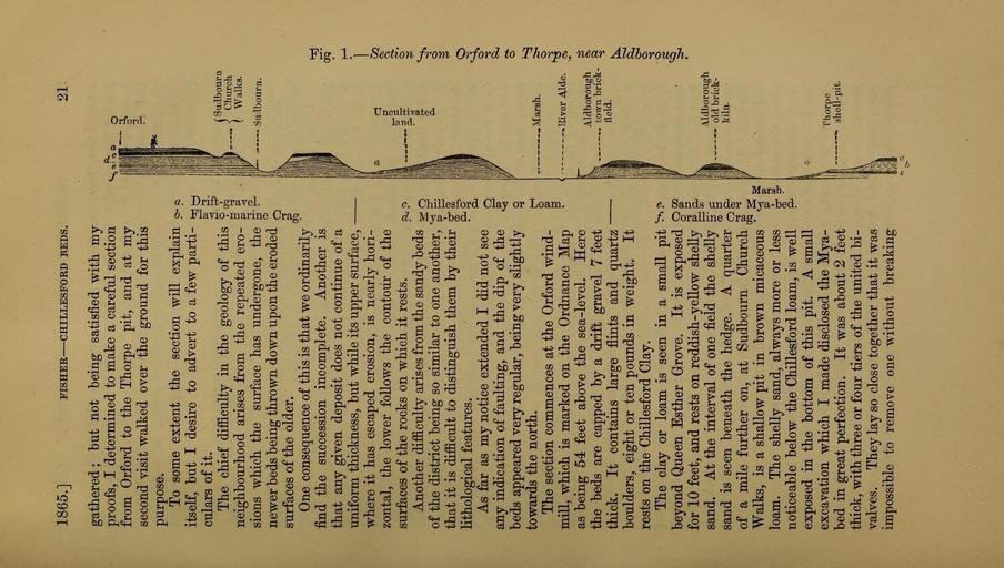 | Keywords: The Quarterly journal of the Geological Society of London (13958352303).jpg  1865 <br> FISHER CHILLESFORD REDS <br> 21 <br> l b <br> i <br> CD <br> gathered; but not being satisfied with my <br> proofs I determined to make a careful section <br> from Orford to the Thorpe pit and at my <br> second visit walked over the ground for this <br> purpose <br> To some extent the section will explain <br> itself but I desire to advert to a few parti- <br> culars of it <br> The chief difficulty in the geology of this <br> neighbourhood arises from the repeated ero- <br> sions which the surface has undergone the <br> newer beds being thrown down upon the eroded <br> surfaces of the older <br> One consequence of this is that we ordinarily <br> find the succession incomplete Another is <br> that any given deposit does not continue of a <br> uniform thickness but while its upper surface <br> where it has escaped erosion is nearly hori- <br> zontal the lower follows the contour of the <br> surfaces of the rocks on which it rests s o <br> Another difficulty arises from the sandy beds q <br> of the district being so similar to one another ' <br> that it is difficult to distinguish them by their <br> lithological features <br> As far as my notice extended I did not see <br> any indication of faulting and the dip of the <br> beds appeared very regular being very slightly <br> towards the north <br> The section commences at the Orford wind- <br> mill which is marked on the Ordnance Map <br> as being 54 feet above the sea-level Here <br> the beds are capped by a drift gravel 7 feet <br> thick It contains large flints and quartz –  <br> boulders eight or ten pounds in weight It <br> rests on the Chillesford Clay <br> The clay or loam is seen in a small pit ' <br> beyond Queen Esther Grove It is exposed W <br> for 10 feet and rests on reddish-yeUow sheUy p i <br> sand At the interval of one field the sheUy <br> sand is seen beneath the hedge A quarter <br> of a mile further on at Sudbourn Church <br> Walks is a shallow pit in brown micaceous <br> loam The shelly sand always more or less <br> noticeable below the ChiUesford loam is well <br> exposed in the bottom of this pit A small <br> excavation which I made disclosed the Mya- <br> bed in great perfection It was about 2 feet <br> thick with three or four tiers of the united bi- <br> valves They lay so close together that it was <br> impossible to remove one without breaking <br> CD i-K <br> p <br> a <br> o <br> <br> go <br> B <br> CD tS <br> W 3- <br> CD ˘ <br> Sudboura <br> Church <br> i Walks <br> IL- SuJbourn <br> Marsh <br> TJiver Aide <br> Aldborough <br> town brick- <br> field <br> 5q <br> o <br> f <br> O <br> 4 <br> Aldborough <br> ' old brick- <br> kiln <br> Ttorpe <br> ahell-pit 36164418 111477 51125 Page 21 Text v 22 http //www biodiversitylibrary org/page/36164418 1866 Geological Society of London Biodiversity Heritage Library The Quarterly journal of the Geological Society of London v 22 1866 Geology Periodicals Smithsonian Libraries bhl page 36164418 dc identifier http //biodiversitylibrary org/page/36164418 smithsonian libraries Information field Flickr posted date ISOdate 2014-04-21 Check categories 2015 August 26 CC-BY-2 0 BioDivLibrary https //flickr com/photos/61021753 N02/13958352303 2015-08-26 06 55 17 cc-by-2 0 PD-old-70-1923 The Quarterly journal of the Geological Society of London 1866 Photos uploaded from Flickr by Fæ using a script |