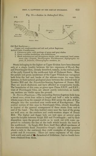 | Keywords: The Quarterly journal of the Geological Society of London (13860052655).jpg PROF C LAP WORTH ON THE OTRVAN SUCCESSION <br> 613 <br> i\ W <br> Fig 19 ” Section in Ddlamford Glen <br> Mi <br> 0l o ffeo <br> Sandstone <br> A row£ i i £eds <br> Old Eed Sandstone ” <br> Coarse red conglomerates and red and yellow flagstones <br> Ardwell beds Cascade-zone <br> 3 Calcareous grits with partings of green and grey shales <br> 2 Green nodular sandstones non-fossiliferous <br> 1 Black carbonaceous and ferruginous shales with occasional hard arena- <br> ceous ribs ” Lingula Dicellograptus Forchhammeri Dijilograptus ru- <br> gosus D foliaceus Climacograptus caudatus c <br> Strata belonging to the higher or Upper division have been detected <br> only at a single locality between the two exposures of Myoch Bay <br> and Penwhapple Glen already described namely in the central parts <br> of the gully formed by the north-east fork of Piedmont Burn Here <br> the purple and green mudstones of the Upper Whitehouse variegated <br> beds form the bed and banks of the stream-course for some little <br> distance in their natural geological place between the Ardwell beds of <br> Trowier Hill and the JS'ematolites-heaTmg flagstones of Doune Hill <br> They are much shattered and have afforded no recognizable fossils <br> The boundaries of this zone as given upon Plates XXIV andXXY <br> west of Penwhapple Glen are almost purely inferential as hardly <br> any sections are visible upon the ground <br> B Barren Flagstones ” The succeeding Barren-flagstone beds form <br> a broad zone about four miles in length and half a mile in width <br> which ranges from the summit of Doune Hill across the glen of Pen- <br> whapple into the moorland area north-west of Knockgerran The <br> central section of this zone in Penwhapple Glen already described <br> is typical of the general arrangement of these strata from end to <br> end of the band The thin-bedded zones near the base of the group <br> are well seen on the southern and south-western slopes of Doune <br> Hill The higher and flaggy beds are laid open at several spots <br> upon the heights between Saugh Hill and Penwhapple ; and by their <br> disposition upon the ground enable us to mark out with some ap- <br> proach to certainty the line of the fault which bounds the band to <br> the northward In Saugh-Hill Burn itself they afford specimens of <br> the characteristic fossil Nematolites Grayii; and in some quarries <br> about a mile to the eastward they yield examples of Diplograptus <br> pristis and D truncatus There are many exposures of the same <br> beds south and east of e farmstead of Littlelane ; but no fossils have <br> been obtained from them 36936442 113692 51125 Page 613 Text 38 http //www biodiversitylibrary org/page/36936442 1882 Geological Society of London NameFound Climacograptus caudatus NameConfirmed Climacograptus caudatus NameBankID 6599587 NameFound Dicellograptus NameConfirmed Dicellograptus NameBankID 4139750 NameFound Dicellograptus foliaceus NameConfirmed Dicellograptus foliaceus NameFound Diplograptus pristis NameConfirmed Diplograptus pristis NameFound Diplograptus truncatus NameConfirmed Diplograptus truncatus NameFound Lingula NameConfirmed Lingula EOLID 11118945 NameBankID 2765654 NameFound Nematolites NameConfirmed Nematolites NameBankID 4928149 Biodiversity Heritage Library The Quarterly journal of the Geological Society of London v 38 1882 Geology Periodicals Smithsonian Libraries bhl page 36936442 dc identifier http //biodiversitylibrary org/page/36936442 smithsonian libraries Information field Flickr posted date ISOdate 2014-04-15 Check categories 2015 August 26 CC-BY-2 0 BioDivLibrary https //flickr com/photos/61021753 N02/13860052655 2015-08-26 07 56 35 cc-by-2 0 PD-old-70-1923 The Quarterly journal of the Geological Society of London 1882 Photos uploaded from Flickr by Fæ using a script |