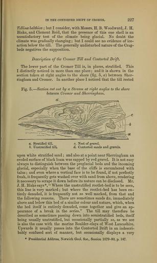 | Keywords: The Quarterly journal of the Geological Society of London (13859822653).jpg of the Cromer Till and Contorted Drift <br> The lower part of the Cromer Till is in places stratified This <br> I distinctly noticed in more than one place ; and it is shown in the <br> section taken at right angles to the shore fig 5 a between Sher- <br> ringham and Cromer In another place I noticed that the till rested <br> Fig 5 ” Section cut out by a Stream at right angles to the shore <br> between Cromer and Sherringham <br> a Stratified till <br> b Unstratified till <br> c Nest of gravel <br> d Contorted sands and gravels <br> upon white stratified sand ; and also at a point near Sherringham an <br> eroded surface of black loam was capped by red gravel It is not easy <br> always to distinguish between the preglacial beds and the incoming <br> glacial especially when the base of the cliffs is encumbered with <br> talus ; and even where a vertical face is to be found if not perfectly <br> fresh it frequently gets washed over with sand from above rendering <br> it necessary to scrape it down before its nature can be disclosed Mr <br> J H Blake says Where the unstratified rootlet-bed is to be seen <br> this line is very marked ; but where the rootlet-bed has been en- <br> tirely denuded it is frequently not so well marked from that and <br> the following reasons There are sometimes sands c immediately <br> above and below this bed of a similar colour and nature which when <br> the bed itself is entirely denuded come together and give an ap- <br> pearance of a break in the series The till may therefore be <br> described as sometimes passing down into semistratified beds itself <br> being usually unstratified but occasionally partially so as we see <br> is also the case with the marine Boulder-clays of West Lancashire <br> Upwards it usually passes into the Contorted Drift in an indescri- <br> bably confused sort of manner but occasionally displays a very <br> Presidential Address Norwich Geol Soc Session 1879-80 p 147 36936004 113692 51125 Page 227 Text 38 http //www biodiversitylibrary org/page/36936004 1882 Geological Society of London NameFound Tellina balthica NameConfirmed Tellina balthica Biodiversity Heritage Library The Quarterly journal of the Geological Society of London v 38 1882 Geology Periodicals Smithsonian Libraries bhl page 36936004 dc identifier http //biodiversitylibrary org/page/36936004 smithsonian libraries Information field Flickr posted date ISOdate 2014-04-15 Check categories 2015 August 26 CC-BY-2 0 BioDivLibrary https //flickr com/photos/61021753 N02/13859822653 2015-08-26 07 55 14 cc-by-2 0 PD-old-70-1923 The Quarterly journal of the Geological Society of London 1882 Photos uploaded from Flickr by Fæ using a script |