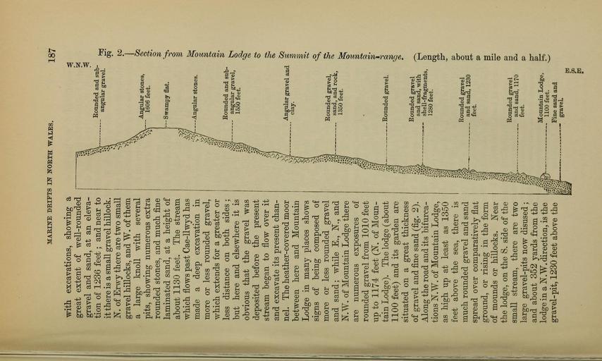 | Keywords: The Quarterly journal of the Geological Society of London (13860145904).jpg MARINE DRIFTS IN NORTH WALES <br> 187 <br> with excavations showing a <br> great extent of well-rounded <br> gravel and sand at an eleva- <br> tion of 1236 feet ; and near to <br> it there is a small gravel hillock <br> jN of Erwy there are two small <br> gravel hillocks and W of them <br> a large knoll with several <br> pits showing numerous extra <br> rounded stones and much fine <br> laminated sand at a height of <br> about 1130 feet The stream <br> which flows past Cae-llwyd has <br> made a deep excavation in <br> more or less rounded gravel <br> which extends for a greater or <br> less distance on both sides ; <br> but here and elsewhere it is <br> obvious that the gravel was <br> deposited before the present <br> stream began to flow over it <br> and excavate its present chan- <br> nel The heather-covered moor <br> between here and Mountain <br> Lodge in many places shows <br> signs of being composed of <br> more or less rounded gravel <br> and sand; while E N and <br> N W of Mountain Lodge there <br> are numerous exposures of <br> rounded gravel from 1010 feet <br> up to 1174 feet N of Moun- <br> tain Lodge The lodge about <br> 1100 feet and its garden are <br> situated on a great thickness <br> of gravel and fine sand fig 2 <br> Along the road and its bifurca- <br> tions N W of Mountain Lodge <br> as high up at least as 1350 <br> feet above the sea there is <br> much rounded gravel and sand <br> spread over comparatively flat <br> ground or rising in the form <br> of mounds or hillocks Near <br> the lodge on the 8 side of the <br> small stream there are two <br> large gravel-pits now disused ; <br> and about 352 yards from the <br> lodge in a N W direction is the <br> gravel-pit 1230 feet above the <br> Rounded and sub- <br> angular gravel <br> VA Angular stonea <br> s A 1606 feet <br> ” Swampy flat <br> Y Angular stones <br> Rounded and sub- <br> ” angular gravel <br> 1550 feet <br> cfq' <br> to <br> Qq <br> § <br> Sq <br> Angular gravel and S <br> Rounded gravel <br> sand and rock <br> 1350 feet <br> -Rounded gravel <br> o <br> Bounded gravel <br> and sand with £- <br> ' shell-fragments CD <br> 1280 feet <br> Rounded gravel <br> and sand 1230 <br> feet <br> Rounded gravel <br> and sand 1170 <br> feet <br> Mountain Lodge CH <br> ¢ 1100 feet 3 <br> Pine sand and <br> ' gravel <br> m 36935962 113692 51125 Page 187 Text 38 http //www biodiversitylibrary org/page/36935962 1882 Geological Society of London Biodiversity Heritage Library The Quarterly journal of the Geological Society of London v 38 1882 Geology Periodicals Smithsonian Libraries bhl page 36935962 dc identifier http //biodiversitylibrary org/page/36935962 smithsonian libraries Information field Flickr posted date ISOdate 2014-04-15 Check categories 2015 August 26 CC-BY-2 0 BioDivLibrary https //flickr com/photos/61021753 N02/13860145904 2015-08-26 07 51 40 cc-by-2 0 PD-old-70-1923 The Quarterly journal of the Geological Society of London 1882 Photos uploaded from Flickr by Fæ using a script |