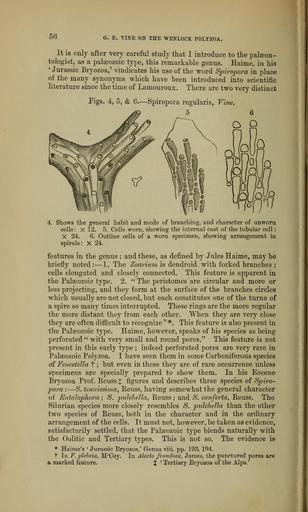 Keywords: The Quarterly journal of the Geological Society of London (13859705753).jpg 56 <br> G E VINE ON THE WEDLOCK POITZOA <br> It is only after very careful study that I introduce to the paleon- <br> tologist as a palaeozoic type this remarkable genus Haime in his <br> ' Jurassic Bryozoa ' vindicates his use of the word JSpiropora in place <br> of the many synonyms which have been introduced into scientific <br> literature since the time of Lamouroux There are two very distinct <br> 4 5 6 <br> -Spiropora regularis Vine <br> 5 <br> 4 Shows the general habit and mode of branching and character of unworn <br> cells X 12 5 Cells worn showing the internal cast of the tubular cell <br> X 24 6 Outline cells of a worn specimen showing arrangement in <br> spirals X 24 <br> features in the genus ; and these as defined by Jules Haime may be <br> briefly noted ” 1 The Zoarium is dendroid with forked branches ; <br> cells elongated and closely connected This feature is apparent in <br> the Palaeozoic type 2 The peristomes are circular and more or <br> less projecting and they form at the surface of the branches circles <br> which usually are not closed but each constitutes one of the turns of <br> a spire so many times interrupted These rings are the more regular <br> the more distant they from each other When they are very close <br> they are often difficult to recognize This feature is also present in <br> the Palaeozoic type Haime however speaks of his species as being <br> perforated with very small and round pores This feature is not <br> present in this early type; indeed perforated pores are very rare in <br> Palaeozoic Polyzoa I have seen them in some Carboniferous species <br> of Fenestella f ; but even in these they are of rare occurrence unless <br> specimens are specially prepared to show them In his Eocene <br> Bryozoa Prof Eeuss figures and describes three species of Spiro- <br> pora ” S tenuissima Eeuss having somewhat the general character <br> of Entalopliora ; S pulchella Eeuss ; and S conferta Eeuss The <br> Silurian species more closely resembles S pulchella than the other <br> two species of Eeuss both in the character and in the ordinary <br> arrangement of the cells It must not however be taken as evidence <br> satisfactorily settled that the Palaeozoic type blends naturally with <br> the Oolitic and Tertiary types This is not so The evidence is <br> Haime's ' Jurassic Bryozoa ' Genus viii pp 193 194 <br> t In F plebeia M'Coy In Alecto frondosa James the punctured pores are <br> a marked feature ' Tertiary Bryozoa of the Alps ' 36935823 113692 51125 Page 56 Text 38 http //www biodiversitylibrary org/page/36935823 1882 Geological Society of London NameFound Alecto frondosa NameConfirmed Alecto frondosa NameBankID 6235517 NameFound Bryozoa NameConfirmed Bryozoa EOLID 2060 NameBankID 230461 NameFound Fenestella NameConfirmed Fenestella EOLID 13185859 NameBankID 234914 NameFound Fenestella plebeia NameConfirmed Fenestella plebeia NameFound Polyzoa NameConfirmed Polyzoa EOLID 64139 NameBankID 2764675 NameFound Spiropora conferta NameConfirmed Acropora conferta Brook EOLID 4681152 NameFound Spiropora pulchella NameConfirmed Spiropora pulchella NameFound Spiropora regularis NameConfirmed Spiropora regularis Vine NameFound Spiropora tenuissima NameConfirmed Spiraea tenuissima CarriĹ re EOLID 627031 Biodiversity Heritage Library The Quarterly journal of the Geological Society of London v 38 1882 Geology Periodicals Smithsonian Libraries bhl page 36935823 dc identifier http //biodiversitylibrary org/page/36935823 smithsonian libraries Information field Flickr posted date ISOdate 2014-04-15 Check categories 2015 August 26 CC-BY-2 0 BioDivLibrary https //flickr com/photos/61021753 N02/13859705753 2015-08-26 07 53 05 cc-by-2 0 PD-old-70-1923 The Quarterly journal of the Geological Society of London 1882 Photos uploaded from Flickr by Fæ using a script |