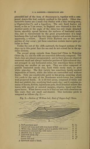 | Keywords: The Quarterly journal of the Geological Society of London (13859673753).jpg AND <br> pinnatifid leaf of the form of Stenocarpus is together with a com- <br> pound Acacia-like leaf entirely confined to this patch Other cha- <br> racteristic leaves are a small oval Smilax with a thin twining stem <br> a Ghjptostrobus and a Lygodium The only fossil feather yet <br> found so far as I am aware in England was obtained in this bed <br> Another patch at the angle of the chine has only single detached <br> leaves smoothly spread between the surfaces of laminated sandy <br> clay and is characterized by the great preponderance of a large <br> hornbeam-like leaf and the very large stipules and serrate leaves of <br> apparently a willow Nearer Poole Harbour one or two small <br> patches of clay occur ; yet these sometimes contain leaves quite pe- <br> culiar to them <br> Unlike the rest of the cliffs eastward the longest sections of the <br> clays up to this point face the sea and do not extend far in the up- <br> chine sections <br> The second group extends from Sugar-loaf Chine to Watering <br> Chine fig 1 ; and the cliffs are somewhat differently composed The <br> black clays are almost unrepresented ; and in their place are observed <br> numerous small and always lenticular patches of light-coloured clay <br> not arranged in any horizontal series but sometimes three or four <br> overlying one another at one spot They are either composed of <br> pinkish laminated sandy clay hard white sandy marl or pure <br> white pipe-clay The first variety has sometimes faintly marked <br> impressions of leaves while the latter are unstratified and without <br> fossils Only one considerable patch in this group occurring about <br> 100 yards to the east of the Branksome watch-tower has yielded <br> well-preserved fossils It is 25' feet across composed of white and <br> drab and pinkish clay overlying black sandy clay; and it contains re- <br> mains of insects flowers leguminous pods small detached willow-like <br> leaves with smooth or serrated margins stipules laurel and Dios- <br> jogros leaves When leaves occur in it that are met with elsewhere on <br> this coast they are small and stunted This lenticular patch is <br> composed as follows fig 2 ” <br> Pig 2 ” Section of Willow-bed East of Sugar-loaf Chine <br> 9- <br> a Buff quartzose sand ft in <br> b Coarse red irony sand with iron layer at base 4 <br> c White clay stained slightly yellow in places with leaves 6 <br> d Cinnamon-coloured clay with leaves 8 <br> e Blackish clay in layers 7 <br> / Yellowish sandy clay 1 <br> White sand 1 <br> Coarse red sand 4 <br> g Quartzose sand to beach 36935789 113692 51125 Page 6 Text 38 http //www biodiversitylibrary org/page/36935789 1882 Geological Society of London NameFound Lygodium NameConfirmed Lygodium EOLID 72830 NameBankID 2645005 NameFound Smilax NameConfirmed Smilax Jorge08 EOLID 3396175 NameFound Stenocarpus NameConfirmed Stenocarpus R Br EOLID 71207 Biodiversity Heritage Library The Quarterly journal of the Geological Society of London v 38 1882 Geology Periodicals Smithsonian Libraries bhl page 36935789 dc identifier http //biodiversitylibrary org/page/36935789 smithsonian libraries Information field Flickr posted date ISOdate 2014-04-15 Check categories 2015 August 26 CC-BY-2 0 BioDivLibrary https //flickr com/photos/61021753 N02/13859673753 2015-08-26 07 56 05 cc-by-2 0 PD-old-70-1923 The Quarterly journal of the Geological Society of London 1882 Photos uploaded from Flickr by Fæ using a script |