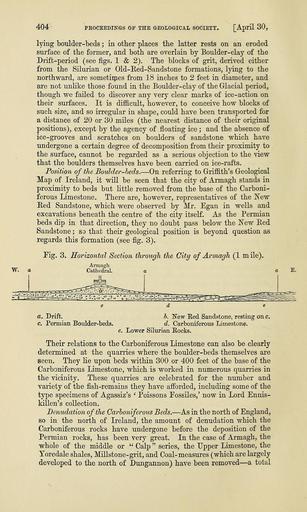 | Keywords: The Quarterly journal of the Geological Society of London (13369100573).jpg 404 <br> PKOCEEDINGS 0E THE GEOLOGICAL SOCIETY April 30 <br> lying boulder-beds ; in otber places tbe latter rests on an eroded <br> surface of the former and both are overlain by Boulder-clay of the <br> Drift-period see figs 1 2 The blocks of grit derived either <br> from the Silurian or Old-Red-Sandstone formations lying to the <br> northward are sometimes from 18 inches to 2 feet in diameter and <br> are not unlike those found in the Boulder-clay of the Glacial period <br> though we failed to discover any very clear marks of ice-action on <br> their surfaces It is difficult however to conceive how blocks of <br> such size and so irregular in shape could have been transported for <br> a distance of 20 or 30 miles the nearest distance of their original <br> positions except by the agency of floating ice ; and the absence of <br> ice-grooves and scratches on boulders of sandstone which have <br> undergone a certain degree of decomposition from their proximity to <br> the surface cannot be regarded as a serious objection to the view <br> that the boulders themselves have been carried on ice-rafts <br> Position of the Boulder-beds ” On referring to Griffith's Geological <br> Map of Ireland it will be seen that the city of Armagh stands in <br> proximity to beds but little removed from the base of the Carboni- <br> ferous Limestone There are however representatives of the New <br> Red Sandstone which were observed by Mr Egan in wells and <br> excavations beneath the centre of the city itself As the Permian <br> beds dip in that direction they no doubt pass below the New Bed <br> Sandstone ; so that their geological position is beyond question as <br> regards this formation see fig 3 <br> Fig 3 Horizontal Section through the City of Armagh 1 m ile <br> a Drift <br> c Permian Boulder-beds <br> h New Eed Sandstone resting on c <br> d Carboniferous Limestone <br> e Lower Silurian Eocks <br> Their relations to the Carboniferous Limestone can also be clearly <br> determined at the quarries where the boulder-beds themselves are <br> seen They lie upon beds within 300 or 400 feet of the base of the <br> Carboniferous Limestone which is worked in numerous quarries in <br> the vicinity These quarries are celebrated for the number and <br> variety of the fish-remains they have afforded including some of the <br> type specimens of Agassiz's ' Poissons Eossiles ' now in Lord Ennis- <br> kiUen's collection <br> Denudation of the Carboniferous Beds ” As in the north of England <br> so in the north of Ireland the amount of denudation which the <br> Carboniferous rocks have undergone before the deposition of the <br> Permian rocks has been very great In the case of Armagh the <br> whole of the middle or Calp series the Upper Limestone the <br> Yoredale shales Millstone-grit and Coal-measures which are largely <br> developed to the north of Dungannon have been removed ” a total 39051336 120601 51125 Page 404 Text v 29 http //www biodiversitylibrary org/page/39051336 1873 Geological Society of London Biodiversity Heritage Library The Quarterly journal of the Geological Society of London v 29 1873 Geology Periodicals Smithsonian Libraries bhl page 39051336 dc identifier http //biodiversitylibrary org/page/39051336 smithsonian libraries Information field Flickr posted date ISOdate 2014-03-24 Check categories 2015 August 26 CC-BY-2 0 BioDivLibrary https //flickr com/photos/61021753 N02/13369100573 2015-08-26 10 55 02 cc-by-2 0 PD-old-70-1923 The Quarterly journal of the Geological Society of London 1873 Photos uploaded from Flickr by Fæ using a script |