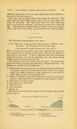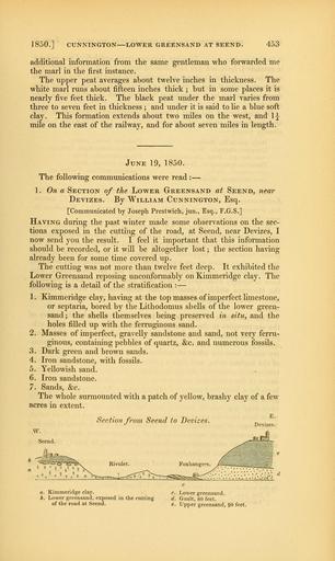 Keywords: The Quarterly journal of the Geological Society of London (13365642083).jpg 1850 <br> CUNNINGTON LOWER GREENSAND AT SEEND <br> 453 <br> additional information from the same gentleman who forwarded me <br> the marl in the first instance <br> The upper peat averages about twelve inches in thickness The <br> white marl runs about fifteen inches thick ; but in some places it is <br> nearly five feet thick The black peat under the marl varies from <br> three to seven feet in thickness ; and under it is said to lie a blue soft <br> clay This formation extends about two miles on the west and 1 <br> mile on the east of the railway and for about seven miles in length <br> June 19 1850 <br> The following communications were read ” <br> I On a Section of the Lower Greensand at Seend near <br> Devizes By William Cunnington Esq <br> Communicated by Joseph Prestwich jun Esq F G S <br> Having during the past winter made some observations on the sec- <br> tions exposed in the cutting of the road at Seend near Devizes I <br> now send you the result I feel it important that this information <br> should be recorded or it will be altogether lost ; the section having <br> already been for some time covered up <br> The cutting was not more than twelve feet deep It exhibited the <br> Lower Greensand reposing unconformably on Kimmeridge clay The <br> following is a detail of the stratification ” <br> 1 Kimmeridge clay having at the top masses of imperfect limestone <br> or septaria bored by the Lithodomus shells of the lower green- <br> sand; the shells themselves being preserved in situ and the <br> holes filled up with the ferruginous sand <br> 2 Masses of imperfect gravelly sandstone and sand not very ferru- <br> ginous containing pebbles of quartz c and numerous fossils <br> 3 Dark green and brown sands <br> 4 Iron sandstone with fossils <br> 5 Yellowish sand <br> 6 Iron sandstone <br> 7 Sands c <br> The whole surmounted with a patch of yellow brashy clay of a few <br> acres in extent <br> Section from Seend to Devizes <br> E <br> Devizes <br> Kimmeridge clay <br> Lower greensand exposed in the cutting <br> of the road at Seend <br> c Lower greensand <br> d Gault 80 feet <br> e Upper greensand 90 feet 36934324 113689 51125 Page 453 Text v 6 http //www biodiversitylibrary org/page/36934324 1850 Geological Society of London NameFound Lithodomus NameConfirmed Lithodomus EOLID 2989808 NameBankID 4223669 Biodiversity Heritage Library The Quarterly journal of the Geological Society of London v 6 1850 Geology Periodicals Smithsonian Libraries bhl page 36934324 dc identifier http //biodiversitylibrary org/page/36934324 smithsonian libraries Information field Flickr posted date ISOdate 2014-03-23 Check categories 2015 August 26 CC-BY-2 0 BioDivLibrary https //flickr com/photos/61021753 N02/13365642083 2015-08-26 10 54 40 cc-by-2 0 PD-old-70-1923 The Quarterly journal of the Geological Society of London 1850 Photos uploaded from Flickr by Fæ using a script |
