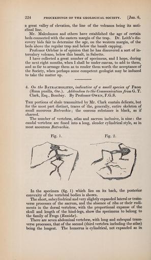 | Keywords: The Quarterly journal of the Geological Society of London (13205800975).jpg 224 PROCEEDINGS OF THE GEOLOGICAL SOCIETY Jan 6 <br> a great valley of elevation the line of the volcanos being its anti- <br> clinal line <br> Mr Malcolmson and others have established the age of certain <br> beds connected with the eastern margin of the trap Dr Leith's dis- <br> covery bids fair to determine the age on the western margin of the <br> beds above the regular trap and below the basalt capping <br> Professor Orlebar is of opinion that he has discovered a sort of in- <br> tercalary volcano below this basalt in Salsette <br> I have collected a great number of specimens and I hope during <br> the next eight months when I shall be under canvas to add to them <br> and so far to arrange them as to render them worth the acceptance of <br> the Society when perhaps some competent geologist may be induced <br> to take the matter up <br> 4 On the Batracholites indicative of a small species of Frog <br> Rana pusilla Ow Addendum to the Communication from G T <br> Clark Esq Bombay By Professor Ow en F G S <br> The portions of shale transmitted by Mr Clark contain delicate but <br> for the most part distinct traces of the generally entire skeleton of <br> small anourous Batrachia ; the osseous substance is black as if <br> charred <br> The number of vertebrae atlas and sacrum inclusive is nine the <br> caudal vertebrae are fused into a long slender cylindrical style as in <br> most anourous Batrachia <br> Fig 1 Fig 2 <br> In the specimen fig 1 which lies on its back the posterior <br> convexity of the vertebral bodies is shown <br> The short subcylindrical and very slightly expanded lateral or trans- <br> verse processes of the sacrum and the absence of ribs or their rudi- <br> ments in the dorsal vertebrae with the proportional expanse of the <br> skull and length of the hind-legs show the specimens to belong to <br> the family of Frogs Ranidce <br> There are seven abdominal vertebrae with long and subequal trans- <br> verse processes that of the second third vertebra including the atlas <br> being the longest The humerus is cylindrical not expanded as in 36932961 113687 51125 Page 224 Text v 3 http //www biodiversitylibrary org/page/36932961 1847 Geological Society of London NameFound Batrachia NameConfirmed Batrachia EOLID 12111331 NameBankID 5952690 NameFound Rana pusilla NameConfirmed Rana pusilla NameBankID 6723109 Biodiversity Heritage Library The Quarterly journal of the Geological Society of London v 3 1847 Geology Periodicals Smithsonian Libraries bhl page 36932961 dc identifier http //biodiversitylibrary org/page/36932961 smithsonian libraries Information field Flickr posted date ISOdate 2014-03-17 Check categories 2015 August 26 CC-BY-2 0 BioDivLibrary https //flickr com/photos/61021753 N02/13205800975 2015-08-26 12 56 40 cc-by-2 0 PD-old-70-1923 The Quarterly journal of the Geological Society of London 1847 Photos uploaded from Flickr by Fæ using a script |