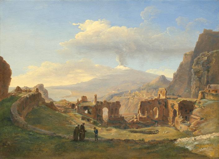 MAKE A MEME View Large Image The Roman Theater at Taormina A10060.jpg artwork creator Louise-Joséphine Sarazin de Belmont French 1790 - 1870 The Roman Theater at Taormina Q20185648 1828 oil on paper on canvas overall 43 2 x 59 7 cm 17 x 23 1/2 in framed 55 9 x 71 8 x ...