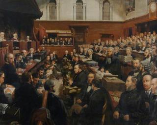 | Keywords: The Tichborne Trial by Frederick Sargent.jpg Scene from the Tichborn criminal trial Regina v Castro which took place in 1873 “74 at the Court of Queen's Bench London The Claimant probably named Arthur Orton is the bearded man in the lower centre of the picture facing left; he is sitting in front of his lawyer Edward Kenealy who is leaning against the desk BBC Your Paintings http //www bbc co uk/arts/yourpaintings/ Website; http //www bbc co uk/arts/yourpaintings/paintings/edward-clive-herbert-17851848-2nd-earl-of-powis-of-the-th102205 Artwork information; http //ichef bbci co uk/arts/yourpaintings/images/paintings/pca/large/nti_pca_86478_large jpg Image file between 1873 1899 Oil on canvas size cm 100 125 Hampshire County Council Museums Service Winchester object history Purchased in 2004 exhibition history credit line accession number FA2005 237 1 other versions PD-Art PD-old-100 19th-century oil on canvas paintings in the United Kingdom Courtrooms in art London in the 1870s Tichborne case Trials in art Images from BBC Your Paintings Frederick Sargent |