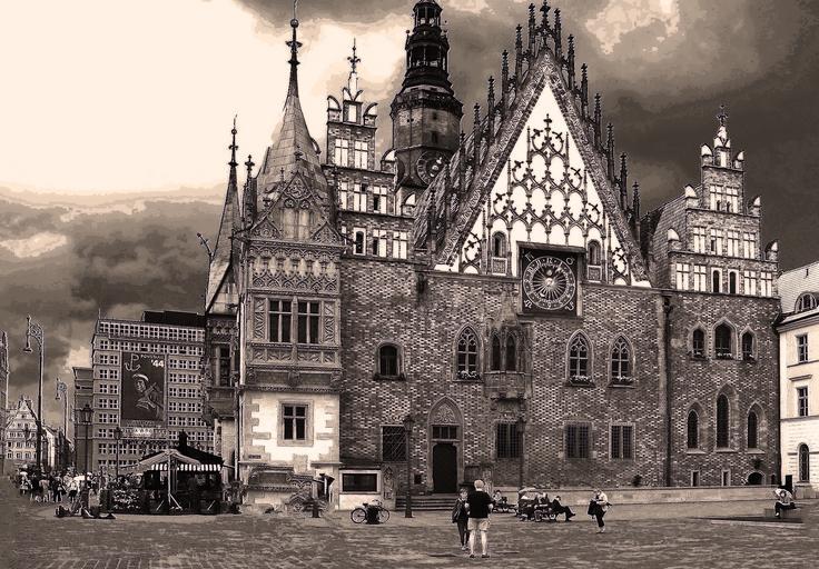 Keywords: the town hall wrocław the market old town the old town historic building monument style architecture towers town hall the bell tower gothic figure tech black and white sepia historical