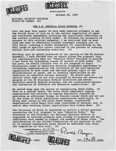 | Keywords: The U.S. Umbrella Talks Proposal - NARA - 198278.tif Scope and content General notes 198278 Local identifier President 1981-1989 Reagan National Security Council 1981 - 1989 Ronald Reagan Library NLRR 40 Presidential Drive Simi Valley CA 93065-0600 date 1984 10 26 Record group Collection RR-NSC Numbered National Security Policy Papers 1981 - 1989 Record group ARC 1189 National Security Decision Directives compiled 02/25/1981 - 01/19/1989 Series ARC 198166 File unit File unit ARC Variant control numbers NAIL Control Number NLS-NSC-NSDD-148 yes Other versions <gallery> File The_U S _Umbrella_Talks_Proposal_-_NARA_-_198278 tif tif File The_U S _Umbrella_Talks_Proposal_-_NARA_-_198278 jpg jpg </gallery> NARA-cooperation PD-USGov Presidential Decision Directives Reagan NARA TIF images with categorized JPGs |