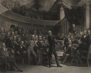 Keywords: The United States Senate, A.D. 1850, by Peter F. Rothermel (crop2).jpg LargeImage This engraving depicts the Golden Age of the United States Senate in the Old Senate Chamber site of many of the institution's most memorable events Here Henry Clay the Great Compromiser introduces the Compromise of 1850 in his last significant act as a senator In a desperate attempt to prevent war from erupting the Great Triumvirate of Daniel Webster of Massachusetts John C Calhoun of South Carolina and Clay of Kentucky struggled to balance the interests of the North South and West This image shows all three men with Clay at center stage presenting his compromise to the Senate Daniel Webster is seated to the left of Clay and John C Calhoun to the left of the Speaker's chair c 1855 Carl Schurz Life of Henry Clay Boston Houghton Mifflin Co 1899 Vol 2 facing p 226 object history exhibition history credit line DRAWN BY P F ROTHERMEL Entered according to Act of Congress in the year 1855 by John M Butler and Alfred Long in the Clerks Office of the District Court of the United states in and for the Eastern District of Pennsylvania ENGRAVED BY R WHITECHURCH THE UNITED STATES SENATE A D 1850 This Engraving from the Original Picture is respectfully dedicated to the People of the United States by the Publishers John M Butler and Alfred Long 84 CHESTNUT ST PHILADELPHIA PA accession number LOC-image ppmsca 09398 place of creation Published Philadelphia Pa John M Butler and Alfred Long c1855 The United States Senate A D 1850 by Peter F Rothermel jpg 150 Other versions all based on the same full resolution image from the Library of Congress <gallery widths 120 heights 95 > File The United States Senate A D 1850 by Peter F Rothermel jpg Full resolution original image from LOC File The United States Senate A D 1850 by Peter F Rothermel crop1 jpg Full resolution cropped to frame/border and cleaned up a little </gallery> Also see Category The United States Senate A D 1850 by Peter F Rothermel Caption Collapse top Engraving with the caption transcribed and rendered in markup 0 cellspacing 0 style text-align center; white-space nowrap; background-color E4E0D6; color 333333; font-family arial sans-serif; border solid 2px aaaaaa; - 3 <div style padding 55px 70px 0 70px; >1420px</div> - font-size 10px; text-align left; padding-left 72px; DRAWN BY P F ROTHERMEL font-size 9px; Entered according to Act of Congress in the year 1855 by John M Butler and Alfred Long in the Clerks Office of the District Court of the United states in and for the Eastern District of Pennsylvania font-size 10px; text-align right; padding-right 72px; ENGRAVED BY R WHITECHURCH - 3 style font-size 28px; font-family 'Palatino Linotype' serif; letter-spacing 3px; padding-top 6px; THE UNITED STATES SENATE A D 1850 - 3 style font-size 18px; padding 6px 0 6px 0; font-family 'times new roman' serif; This Engraving from the Original Picture is respectfully dedicated to the People of the United States by the Publishers - 3 style font-size 11px; padding-bottom 6px; JOHN M BUTLER AND ALFRED LONG 84 CHESTNUT ST PHILADELPHIA PA Collapse bottom PD-old-100-1923 The United States Senate A D 1850 by Peter F Rothermel |