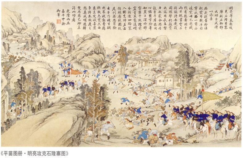 | Keywords: The Victorious Battle at Shilong.jpg en A scene of the Chinese Campaign against the Miao Hunan 1795 zh-hans å¹³å®šè‹—ç–†æˆ˜å½¹ä¹‹ä¸ ” ”攻克石隆苗寨 http //www battle-of-qurman com cn/e/hist htm late XVIII century A collaboration between Chinese and European painters The Jesuit missionaries involved in producing the drawings in China were Giuseppe Castiglione Jean-Denis Attiret Ignace Sichelbart and Jean Damascene The engravings were executed in Paris under the direction of Charles-Nicolas Cochin of the Académie Royal at the Court of Louis XVI and the individual engravers include Le Bas Aliamet Prevot Saint-Aubin Masquelier Choffard and Launay PD-Art Military of Qing China Ten Great Campaigns Paintings of the Qing Dynasty |