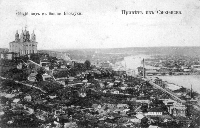 | Keywords: The view from the tower Veseluha 1.jpg en The view from the tower at the Cathedral Veseluha mountain part of the fortress wall the Dnieper ru Вид с башни Веселуха на Собо ную го у часть к епостной стены Днеп О игинальная отк ытка е установлены До 1917 года PD-RusEmpire 20th-century postcards Postcards of Smolensk |