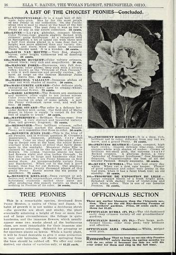 | Keywords: The wonderful new rose hoosier beauty (16387831672).jpg 16 <br> ELLA V BAINES THE WOMAN FLORIST SPRINGFIELD OHIO <br> A LIST OF THE CHOICEST PEONIES Concluded <br> 275 L'INDISPENSABLE It is a huge ball of del- <br> icate baby-pink Has by far the most petals <br> of any Peony in our collection On the Pacific <br> slope this is said to stand at the head of the list <br> of all varieties The past June it was as fine a <br> Peony as any in our entire collection 35 cents <br> 135 LINNE Large globular compact bloom <br> Color Tyrian-rose; guards slightly necked with <br> crimson; quite floriferous At a reception held <br> in Springfield a lot of Linne cut with three and <br> a half foot stems placed in a vase four feet in <br> height was more admired than any variety dis- <br> played and there were some three thousand <br> Peony blooms used It is a wonder 50 cents <br> 82 LOUIS VAN HOXJTTE Very fine shapely <br> bloom; color bright violaceous red of dazzling <br> effect 35 cents <br> 138 MADAME BUCQUET Color velvety crimson <br> almost black; very rich and magnificent 50 cts <br> 32 MADAME FOREL Enormous very full dou- <br> ble bloom; color glossy deep pink with a silvery <br> reflex; known as the Princess of Pink Peonies <br> a title it well deserves and proudly carries Al- <br> most as large as the famous Monsieur Jules <br> Elie Extra fine 50 cents <br> 39 MARECHAL VALLIANT Immense globes of <br> clear red with shades of mauve 50 cents <br> 276 MARGUERITE GERARD Color delicate pink <br> changing as the flower ages to creamy- white; <br> a sensational flower 75 cents <br> 31 MARIE LEMOINE The flowers are enormous <br> and massive often eight to ten inches across <br> Color ivory-white with occasional narrow car- <br> mine tracing on edge of some petals A sort <br> the Peony enthusiast raves over and well he <br> may 35 cents <br> 10 MARIE STUART The color is a delicate lav- <br> ender flecked with cerise Our field plot of Marie <br> Stuart in bloom is surely a carpet fit for the <br> feet of angels to tread 50 cents <br> 246 MASTERPIECE Brilliant Tyrian-rose; free <br> bloomer A very distinct and beautiful variety <br> Fine tall grower; fragrant 75 cents <br> 35 MEISSONIER Very brilliant crimson called <br> in the Chicago market the American Beauty <br> Peony as it resembles that Rose in color 50 cents <br> 48 MONSIEUR JULES EL D3 This is the king of <br> all Peonies and is without question M Crousse's <br> masterpiece Immense globular very full <br> flowers Color an ideal glossy lilac-pink shad- <br> ing to deeper rose at the base the entire flower <br> overlaid with a sheen of silver that fairly shim- <br> mers in the sunlight Monsieur Jules Elie is <br> claimed by many to be the largest of all Peony <br> flowers On young vigorous plants we have <br> had flowers eight and nine inches through In <br> fact they are so large and handsome that but <br> few can realize they are Peony blossoms on first <br> seeing them An unapproachable variety from <br> any standpoint When cut in the bud a good <br> keeper thus fine for cut flowers Our planting <br> comprises some twenty thousand plants of this <br> grand Peony Easily scores the six points of <br> excellence 75 cents <br> 6 MONSIEUR KRELAGE Deep currant or sol- <br> ferino-red with amaranthine center The French <br> hybridists evidently spilled their paint pot <br> after producing this superb variety as there is <br> nothing in Peonies of its color 50 cents <br> ffHWI'fjMh <br> 51 PRESIDENT ROOSEVELT It is a deep rich <br> brilliant red in color different from any red we <br> know and a grand Peony 75 cents <br> 50 PRINCESS BEATRICE Large compact high <br> built crown Guards delicate lilac-rose collar <br> creamy-white with shades of amber Crown of <br> brilliant sea-shell pink the extreme center <br> flecked crimson A glorious flower a very <br> splendor of fragrant loveliness; free bloomer <br> fragrant Unquestionably the best of all the <br> tricolor Peonies Simply exquisite 50 cents <br> 40 QUEEN VICTORIA The very best every day <br> white When cut a first rate keeper Flower <br> of good substance and color; very pretty in the <br> bud state when it has a faint blush tint; an old <br> standby 35 cents <br> 181 TRIOMPHE DE EXPOSITION DE LILLE <br> Large compact bloom of a fresh bright pink <br> Splashed with darker tints of violet-rose and <br> with white reflex This is one of our favorite <br> Peonies 75 cents <br> TREE PEONIES <br> This is a remarkable species developed from <br> Peony Mouton a native of China and Japan In <br> habit of growth it is not unlike a deciduous shrub <br> the growths are short and stocky the plant <br> eventually attaining a height of four or more feet <br> and of large circumference; the foliage is quite <br> handsome and the immense flowers which usually <br> appear some two weeks ahead of the herbaceous <br> class are most remarkable for their immense size <br> and gorgeous colorings Splendid for grouping or <br> for specimen plants on lawns While a hardy plant <br> it will be found desirable to give it some protection <br> in very cold latitudes All shoots springing from <br> the base should be rubbed off We offer any color <br> desired our choice of varieties only at 1 25 each <br> OFFICINALIS SECTION <br> These are earlier hloomers than the Chinensis sec- <br> tion They are the old May-flowering Peonies of <br> our mothers' gardens Price 50 cents each; the <br> three for 1 25 <br> OFFICINALIS RUBRA PI PI The old-fashioned <br> early deep crimson variety of our grandmothers' <br> gardans <br> OFFICINALIS ROSEA Fl PI Very large well- <br> formed bloom; color deep pink; very brilliant <br> and effective <br> OFFICINALIS ALBA Mntabilis White Striped <br> with pink <br> Ppmomhpr That so long as we can ship Peonies <br> rVCllldllUd safely during the spring months ire <br> will do so; after it becomes too late we will file <br> your order for them and ship in the fall time 41856315 131010 64616 Page 1