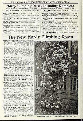 | Keywords: The wonderful new rose hoosier beauty (16201340690).jpg 12 <br> ELLA V BAINES THE WOMAN FLORIST SPRINGFIELD OHIO <br> Hardy Climbing Roses Including Ramblers <br> Two year oId plants 40 cents; three for 1 00 <br> Very double deep pink in large <br> Price 15 cents each; any four for 50 cents <br> AVIATEVR BLERIOT Saffron-yellow golden <br> center <br> BALTIMORE BELLE Blush -white in large <br> clusters <br> CLIMBING BABY RAMBLER Bright red; blooms <br> all the time <br> CRIMSON RAMBLER The flowers are in huge red <br> panicles <br> DR TV VAN FLEET Delicate shade of flesh-pink <br> DOROTHY PERKINS A beautiful shell-pink; full <br> and double <br> EMPRESS OP CHINA Bright pink in large <br> clusters <br> FLOWER OF FAmFEELD The everblooming <br> Crimson Rambler <br> GRAF ZEPPELIN Coral-red; abundant bloomer <br> HIAWATHA Brilliant ruby-carmine with clear <br> white eye <br> LADY GAY <br> clusters <br> MADAME ALFRED CARRIERE Pure white suf- <br> fused with yellow at base of petals <br> MARY WASHLNGTON Pure white; perfectly <br> double; fine <br> PHILADELPHIA RAMBLER Clusters of darkest <br> crimson <br> PRAIRD3 QUEEX The old standby red climber <br> RUSSELL'S COTTAGE Dark red; double and full <br> SEVEN SISTERS Variable crimson to white; in <br> clusters <br> TEXSESSEE BELLE A bright rose-colored flower <br> TRIER Creamy-white producing large clusters <br> WHITE DOROTHY PERKINS Pure white in im- <br> mense clusters <br> YELLOW RAMBLER Aglaia Light lemon-yellow <br> The New Hardy Climbing Roses <br> AMERICAN PILLAR A single flowering <br> varietv of great beauty which appeals <br> to everyone The flowers are of enormous <br> size three to four inches across of a <br> lovely shade of apple-blossom pink with <br> a clear white eye and clusters of yellow <br> stamens These flowers are borne in im- <br> mense bunches They last in perfection <br> a long time and are followed by bril- <br> liant red hips of berries which are car- <br> ried late into the winter; and as the <br> plant frequently retains its lovely green <br> foliage until the end of November it <br> forms a beautiful decorative subject <br> throughout the autumn months 30 cents; <br> two-year plants 50 cents <br> BRAISWICK CHARM For arches per- <br> golas or for screens this variety is un- <br> doubtedly foremost Deep orange-yellow <br> bud shading almost to white on the <br> outer petals as the flower expands The <br> nearest approach to the perpetual flow- <br> ering Wichuraiana 35 cents <br> CHRISTINE WRIGHT or PINK CLLMBING <br> AMERICAN BEAUTY This is identical <br> with the Red Climbing American Beauty <br> described next below this variety; flow- <br> ers four inches in diameter; color bright <br> clear pink immense Try it; a fine com- <br> panion for Climbing American Beauty <br> 20 cents; two-year plants 50 cents <br> CLLMBING AMERICAN BEAUTY ˘ Color <br> red with touches of crimson and in- <br> tensely fragrant 20 cents; two-year <br> plants 40 cents <br> GARDENIA The Hardy Marechal Niel <br> This grand Rose has proven itself hardy <br> in Virginia and Tennessee It is a deep <br> golden-yellow of the largest size 50 <br> cents; two-year plants 1 00 <br> GEISHA Brilliant scarlet-crimson The <br> long shoots are completely covered with <br> bloom the entire length A wonderfully <br> pretty Rose 50 cents <br> LE MEXIftUE Delicate silvery-rose turn- <br> ing to rosy-white reverse of petals light <br> rose Large for its class Flowers full <br> opening 'well produced in clusters Con- <br> tinuous and perpetual flowering 20 <br> cents; two-year plants 50 cents <br> ORIFLAME Bright vivid rose suffused <br> with coppery-gold borne in bunches of <br> numerous flowers with bold fountain- <br> like sprays Extra 50 cents <br> PINK TAUSENDSCHOEN All know that <br> the only fault to find with Tausend- <br> schoen is that it at times is too light in <br> color Here we have in Pink Tausend- <br> schoen the ideal pink Climbing Rose <br> The color resembles the well known <br> Ulrich Brunner Rose with its famous <br> cherry-red color 35 cents; two-year <br> plants 65 cen s <br> 'Thousand Beauties Tausendschoen See page 13 41856319 131010 64616 Page 12 Text http //www biodiversitylibrary org/page/41856319 1918 10 5962/bhl title 64616 Ella V Baines Firm ; Henry G Gilbert Nursery and Seed Trade Catalog Collection NameFound Gardenia NameConfirmed Gardenia Ellis EOLID 29805 Biodiversity Heritage Library Miss Ella V Baines the woman florist Springfield Ohio The wonderful new rose hoosier beauty Garden Stories Bulbs Plants Catalogs Flowers Plants Ornamental Roses Seed industry and trade Seeds Trade catalogs U S Department of Agriculture National Agricultural Library bhl page 41856319 dc identifier http //biodiversitylibrary org/page/41856319 bhlGardenStories BHLinbloom bulbs plants plants ornamental u s department of agriculture national agricultural library bhlgardenstories bhlinbloom Information field Flickr posted date ISOdate 2015-01-28 CC-BY-2 0 BioDivLibrary https //flickr com/photos/61021753 N02/16201340690 2015-08-24 07 55 17 cc-by-2 0 PD-old-70-1923 The wonderful new rose hoosier beauty Photos uploaded from Flickr by FĂŚ using a script |