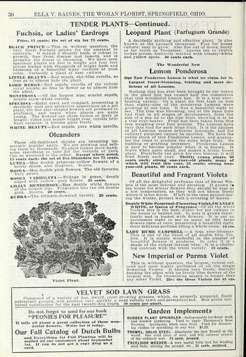 Keywords: The wonderful new rose hoosier beauty (15768779913).jpg 30 <br> ELLA V BAINES THE WOMAN FLORIST SPRINGFIELD OHIO <br> TENDER PLANTS ” Continued <br> Fuchsia or Ladies' Eardrops <br> Price 15 cents; the set of six for 75 cents <br> BLACK PRINCE ” This is without question the <br> very finest Fuchsia- grown for the amateur to <br> cultivate It makes a shapely bush is robust in <br> growth free from disease and insects and is <br> probably the freest in blooming We have seen <br> specimen plants six feet in height and four feet <br> across loaded with thousands of bright buds and <br> blossoms of a beautiful waxy carmine or pink <br> color Certainly a plant of easy culture <br> LITTLE BEAUTY ” Red sepals sky-blue corolla so <br> free as to almost hide the plant <br> LORD BYRON ” Red sepals corolla of the richest <br> royal purple so free in flower as to almost hide <br> the plant <br> BIONSTROSA ” Of the largest size; scarlet sepals <br> double snow-white corolla <br> SPECIOSA ” Habit erect and compact presenting a <br> decidedly neat and attractive appearance as a pot <br> plant the fine star-shaped flowers are produced in <br> profusion and begin when plants are quite <br> young The flowers are three inches or more in <br> length; tubes and sepals bright rose corolla bril- <br> liant carmine; it blooms quite freely <br> WHITE BEAUTY ” Red sepals pure white corolla <br> Oleanders <br> These old-fashioned shrubs are becoming im- <br> mensely popular again We are growing and sell- <br> ing- them by thousands No plant makes more hand- <br> some specimens in tubs for the veranda or yard <br> Can be wintered in the cellar Except where noted <br> 15 cents each; the set of five Oleanders for 75 cents <br> LUTE 4 Has double primrose-yellow flowers of a <br> lovely shade also fragrant Scarce <br> ROSEA ” Has double pink flowers The old favorite <br> Very sweet <br> rosea VARIEGATA ” Foliage is green deeply <br> edged with yellow; pink florets 20 cents <br> LILIAN HENDERSON ” Has double white flowers <br> of the largest size Fragrance like the old double <br> pink Scarce 20 cents <br> RUBRA The crimson-flowered variety 20 cents <br> Violet Plant <br> Leopard Plant Farfugium Grande <br> A decidedly striking and effective plant Is also <br> known as the Leopard Geranium Fine for house <br> culture; easy to grow Also fine out of doors hardy <br> as far north as Tennessee Leaves ten to twelve <br> inches across distinctly marked with creamy-white <br> and yellow spots 40 cents each <br> The Wonderful New <br> Lemon Ponderosa <br> Our New Ponderosa Lemon is what we claim for it <br> Largest freest-blooming fruiting and most de- <br> licious of all Lemons <br> Nothing that has ever been brought to our notice <br> in the plant line has caused half the commotion <br> that this wonderful Lemon has It is a true ever- <br> bearing variety On a plant six feet high no less <br> than eighty-nine of the ponderous Lemons -were <br> growing at one time It was a beautiful sight to <br> see The tree -was blooming and at the same time <br> had fruit in all stages of development from the <br> size of a pea up to the ripe fruit showing it to be <br> a true ever-bearer Fruit has been taken from this <br> tree weighing over four pounds The Lemons have <br> very thin rind for such large fruit It is the juiciest <br> of all Lemons makes delicious lemonade and for <br> culinary purposes cannot be excelled We have the <br> entire stock of this Ponderous Lemon and guaran- <br> tee the trees to produce the same large fruit No <br> budding or grafting necessary Ponderosa Lemon <br> is sure to become popular when it is known It <br> fruits when quite small and makes a lovely house <br> plant Everybody can grow his own lemons; it will <br> fruit freely each year Thrifty young plants 20 <br> cents each; strong one-year-old plants many of <br> which will fruit this year 35 cents; strong two- <br> year-old plants 60 cents each <br> Beautiful and Fragrant Violets <br> Of all the delightful perfumes that of Sweet Vio- <br> lets is the most delicate and pleasing If grown in <br> the house for winter flowers they should be kept at <br> a low temperature as they will not bloom freely <br> where it is too warm If left in the open ground dur- <br> ing the winter protect with a covering of leaves <br> Double White Perpetual-Flowering Violet SWANLEY <br> WHITE or Queen of Fragrance ” Of all the white <br> Violets this is the best either for pot culture in <br> the house or bedded out In pots it grows luxur- <br> iantly and is loaded with flowers It is not an <br> uncommon sight to see as many as fifty large <br> flowers open at once presenting a beautiful sight <br> their delicious perfume filling a whole room 15 cts <br> LADY HTT3IE CAMPBELL ” A true ever-bloomer <br> This is one of the finest of all double blue Vio- <br> lets It is simply wonderful in the number of <br> beautiful flowers it produces In color it is a <br> shade of the richest intense blue It is a charm- <br> ing contrast with the white variety 15 cents <br> New Imperial or Parma Violet <br> This is without question the largest richest col- <br> ored and most highly perfumed of all the single <br> flowering Violets It blooms very freely literally <br> bending the plant with its lovely blue flowers of the <br> largest size Its blossoming season is longer than <br> any other Violet 25c; the three Violets for 45 cts <br> VELVET SOD LAWN GRASS <br> ComDosed of a variety of fine dwarf close-growing grasses which on properly prepared finely <br> pulverised Jround will produce very quickly a neat velvety lawn and permanent sod Has given uni- <br> versal satisfaction for the past twenty-five years 30 cents per quart <br> Do not forget to send for our book <br> PEONIES FOR PLEASURE <br> It tells all about a great collection of these won- <br> derful flowers Write for it today <br> Our Fall Catalog of Dutch Bulbs <br> and Everything for Fall Planting wi