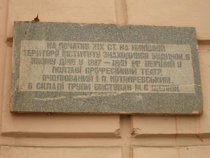 Keywords: Theater by Kotliarevskij.JPG uk а те ито ії інституту знаходився будинок в якому діяв Полтавський п офесійний теат очолюваний Котля евським own Tuma26 Commemorative plaques in Poltava Poltava State Agrarian Academy