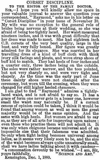 | Keywords: TheFamilyDoctorDec21 1889page267.png <center>CORSET DISCIPLINE <br>TO THE EDITOR OF THE FAMILY DOCTOR </center> SIR --I hope you will kindly allow me space in your valuable journal to answer the question your correspondent Raymond asks me in his letter on Corset Discipline in your issue of November 30 My wife was no exception to the general rule of brides being nervous at their wedding so she was afraid of being too tightly laced Her waist measured nineteen inches and it was with great difficulty that her dress was made to meet She had eighteen inch C B corsets of the very best quality large in the bust and very fully boned Her figure was greatly admired for its elegance She was married in her travelling dress of a kind of buff cloth with thick ivory silk facings and pleats and wove strap shoes of buff kid to match They had heels of four inches and a quarter only three inches being on the outside The soles were rather narrow and the toes pointed but not very sharply so and were very tight and shapely As the time was the early part of June these dainty shoes were not changed after the ceremony but worn till the evening when they were changed for still higher heeled chaussure I am glad to find Raymond admires a tightlylaced waist and is not afraid to say so It has a grace of form one never gets in a looser One however small the waist may naturally be If a correct census of opinion could be taken I think it would be found that among women as well as men the great majority would be of the same opinion And the same with high heels But women are afraud to say so as they are of all arts for improving upon nature ; even those who practise them will not admit it It was only when chignons became universal and of an impossible size that their falseness was admitted So only when tight lacing becomes universal among ladies as it seems very likely soon to be and the size of the waist becomes always quite unnaturally small shall we have ladies talking-about it with candour-- a consumation devoutly to be wished --I am Sir yours faithfully SCIENCE AND ART Kensington Dec It 1889 to Raymond ; from Science and Art PD-Art Tightlacing The Family Doctor 1889 Women in corsets Artworks missing infobox template |