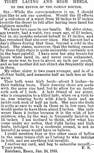 | Keywords: TheFamilyDoctorFeb9 1889page375 .png TIGHT LACING AND HIGH HEELS TO THE EDITOR OF FAMILY DOCTOR SIR --While the correspondence is on I should just like to ask one question Would the ill effects of a reduction of a waist from 23 inches to 17 inches outside the dress be felt after having been laced for eighteen months We have two cases in our family My elder sister age twenty had a waist two years ago of 23 inches but in six months reduced herself to 16 inches and has remained that size ever since She has not had a day's illness during that time beyond a cold in the head She states moreover that the feeling caused by these tight stays is quite enjoyable--certainly not in the least painful I have seen her play tennis for hours when laced in and never seem exhausted Her mode was to bee in about an inch per month and as her mother did not object she frequently slept in them My other sister is two years younger and is of a slighter build and measures half an inch less at the waist They both wear high heels--about 3 inches---to their walking boots Their dancing shoes are made with the same size heel but to allow for an inside cork sock of 1 inch A lady friend of my sister who is companion to a titled lady when on a visit to us was wearing hoots with 4-inch heels and an inside cork sock of half an inch She says she finds it quite as easy to walk in these as in low ones but would prefer to have them about 3 inches She only wears them 4 inches because it is the wish of her mistress who by the way is frequently laced-in to 14 inches I am inclined to think after what has come under my notice that tight lacing and high heels indulged in to a moderate extent is not so harmful as some would have us believe I could mention four or five other cases of ladies in the same tennis club as I belong to who indulge in both and are anything but invalids I enclose my card and beg to subscribe myself -- Yours truly F S Rainham Essex Jan 24 1889 Tightlacing The Family Doctor 1889 Essex from F S PD-Art Artworks missing infobox template |