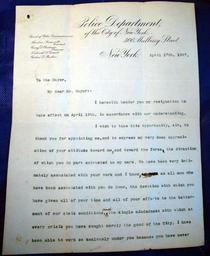 Keywords: Theodore Roosevelt resignation 001.jpg This is page one of Theodore Roosevelt's resignation letter to the Mayor of New York ceding his position as President of the New York Police Department on 17 April 1897 The text is digitized at s Resignation letter Roosevelt Scans are taken from an auction of the letter http //cgi ebay com/THEODORE-ROOSEVELT-Letter-of-Resignation-NYPD_W0QQitemZ320000215450QQihZ011QQcategoryZ33776QQrdZ1QQcmdZViewItem non-permanent online page Additional important information regarding source This letter was stolen in 1974 This letter was in the possession of Margaret Daisy Suckley Daisy was confidant to Franklin Roosevelt a sixth cousin and archivist at the Hyde Park Presidential Library This may have been the source of the revised draft letter Daisy gave it to Francis and Mary Crowell Frank Crowell framed the letter and displayed it in his office at his residence at 17 Mill Street in Rhinebeck NY From Francis and Mary Crowell the letter passed to Janet Montgomery Baldwin Janet T Baldwin lived with Frank and Mary From Janet it passed to Anne B Cox daughter of Janet and then to Michael and Charles Cox sons of Anne residing at 3 N Randolph Ave Poughkeepsie NY In 1973 worried about the safety of the letter Michael folded the letter around a piece of cut cardboard and sealed it behind a framed envelope with an uncut pair of black Washington stamps that hung in a frame on the wall of Cox's bedroom The letter with black Washington stamps was posted circa 1850 and written on blue linen paper The letter was between Eugene Lynch and Ogden Lynch ancestors of Francis Crowell concerning their dry-goods and mining supply trade in Coloma CA The Lynch letter and the Roosevelt letter hidden behind it along with other antiquities including original bills of lading from the Flying Cloud referenced in Lynch's letter were stolen in June 1974 by coworkers who were visiting Anne Cox Anne was packing and making preparations to move her family to California within days of the theft The theft was witnessed by a friend of Michael The friend 15 years old challenged the thieves when they attempted to remove some of Friend's personal property He then noticed articles the thieves had placed in their car but when challenged by the friend the thieves told him the articles were theirs and the friend believed them The full significance was not understood until Michael Cox reported the theft of the article upon arrival and unpacking in California Cox was a minor and the thieves vehemently denied the theft and Cox was now in California so the police did not follow up The image here clearly shows the fold lines of the frame in which Michael Cox placed it 1897-04-17 Theodore Roosevelt Theodore Roosevelt resignation police commissioner 1919 |