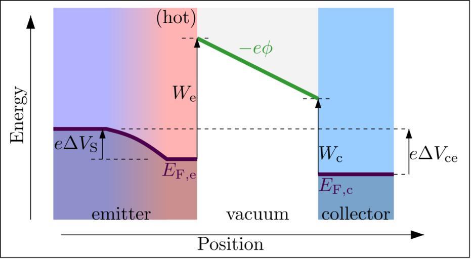 Keywords: Thermionic diode forward bias.svg en Thermionic effect diode under saturated forward bias useable for measuring the work function of the hot emitter 2013-06-17 21 31 04 own Nanite Source code Made using Ipe Source code below also placed into public domain <source lang xml > < xml version 1 0 > < DOCTYPE ipe SYSTEM ipe dtd > <ipe version 70005 creator Ipe 7 1 2 > <info created D 20130513204549 modified D 20130617212945 /> <ipestyle name cust > <symbol name arrow/fnormal spx > <path fill black > 0 0 m -1 0 333 l -1 -0 333 l h </path> </symbol> <pen name heavier value 0 8 /> <pen name fat value 1 2 /> <pen name ultrafat value 2 /> <symbolsize name large value 5 /> <symbolsize name small value 2 /> <symbolsize name tiny value 1 1 /> <arrowsize name large value 10 /> <arrowsize name small value 5 /> <arrowsize name tiny value 3 /> <dashstyle name dashed value 4 0 /> <dashstyle name finedash value 2 0 /> <textsize name large value \large /> <textsize name small value \small /> <textsize name tiny value \tiny /> <textsize name Large value \Large /> <textsize name LARGE value \LARGE /> <textsize name huge value \huge /> <textsize name Huge value \Huge /> <textsize name footnote value \footnotesize /> <textstyle name center begin \begin center end \end center /> <textstyle name itemize begin \begin itemize end \end itemize /> <textstyle name item begin \begin itemize \item end \end itemize /> <gridsize name 4 pts value 4 /> <gridsize name 8 pts ~3 mm value 8 /> <gridsize name 16 pts ~6 mm value 16 /> <gridsize name 32 pts ~12 mm value 32 /> <gridsize name 10 pts ~3 5 mm value 10 /> <gridsize name 20 pts ~7 mm value 20 /> <gridsize name 14 pts ~5 mm value 14 /> <gridsize name 28 pts ~10 mm value 28 /> <gridsize name 56 pts ~20 mm value 56 /> <anglesize name 90 deg value 90 /> <anglesize name 60 deg value 60 /> <anglesize name 45 deg value 45 /> <anglesize name 30 deg value 30 /> <anglesize name 22 5 deg value 22 5 /> <opacity name filled value 0 2 /> <layout paper 248 136 origin 0 0 frame 248 136 /> <gradient name bluered type axial coords 0 0 32 0 > <stop offset 0 color 0 7 0 7 1 /> <stop offset 1 color 1 0 7 0 7 /> </gradient> <tiling name falling angle -60 step 4 width 1 /> <tiling name rising angle 30 step 4 width 1 /> </ipestyle> <page> <layer name alpha /> <layer name BBOX /> <view layers alpha BBOX active alpha /> <path layer alpha fill 0 95 > 100 132 m 104 116 l 168 84 l 172 132 l h </path> <path matrix 1 0 0 1 -120 -644 fill 0 6 0 8 1 > 288 776 m 288 664 l 328 664 l 328 776 l h </path> <path fill black opacity filled > 208 44 m 208 20 l 168 20 l 168 44 l h </path> <path fill 0 7 0 7 1 > 64 132 m 64 20 l 28 20 l 28 132 l h </path> <path matrix 1 0 0 1 -120 -644 fill 1 0 7 0 7 > 224 776 m 224 664 l 200 664 l 200 776 l h </path> <path matrix 1 0 0 1 56 20 fill white gradient bluered > 32 112 m 32 0 l 0 0 l 0 112 l h </path> <path fill black opacity filled > 28 68 m 56 68 l 72 64 88 52 s 104 52 l 104 20 l 28 20 l </path> <path matrix 1 0 0 1 0 4 stroke black pen ultrafat > 4 100 m 4 100 l 4 100 l 4 100 l h </path> <path stroke black arrow fnormal/normal > 16 20 m 16 128 l </path> <path matrix 1 0 0 1 -104 -652 stroke black arrow fnormal/normal > 136 664 m 328 664 l </path> <text matrix 0 1 -1 0 796 -100 pos 160 784 stroke black type label width 30 884 height 6 815 depth 1 93 valign baseline >Energy</text> <text matrix 1 0 0 1 2 663 -669 875 transformations translations pos 101 337 719 875 stroke black type label width 18 901 height 6 808 depth 2 85 halign right valign top >\textcolorrgb 0 3 0 0 3 E_ \rm F e </text> <text matrix 1 0 0 1 -88 -652 transformations translations pos 192 656 stroke black type label width 35 34 height 6 808 depth 0 valign baseline >Position</text> <path matrix 1 0 0 1 -120 -644 stroke black dash finedash > 216 760 m 232 760 l </path> <path matrix 1 0 0 1 -56 -676 stroke black dash finedash > 216 760 m 232 760 l </path> <path matrix 1 0 0 1 -16 -716 stroke black dash finedash > 216 760 m 232 760 l </path> <path matrix 1 0 0 1 -120 -644 stroke black dash finedash > 168 696 m 200 696 l </path> <path matrix 1 0 0 1 -120 -644 stroke black dash finedash > 184 712 m 336 712 l </path> <text matrix 1 0 0 1 -124 -640 transformations translations pos 228 724 stroke black type label width 13 45 height 6 812 depth 1 49 halign right valign baseline > W_ \rm e </text> <text matrix 1 0 0 1 -60 -672 transformations translations pos 228 724 stroke black type label width 13 45 height 6 812 depth 1 49 valign baseline > W_ \rm c </text> <text matrix 1 0 0 1 -84 -644 transformations translations pos 136 704 stroke black type label width 23 651 height 6 812 depth 1 49 halign right valign center > e\Delta V_ \rm S </text> <text matrix 1 0 0 1 -120 -772 transformations translations pos 184 792 stroke black type label width 31 576 height 6 654 depth 0 halign center valign baseline >emitter</text> <text matrix 1 0 0 1 -48 -772 transformations translations pos 184 792 stroke black type label width 33 486 height 4 289 depth 0 halign center valign baseline >vacuum</text> <text matrix 1 0 0 1 4 -772 transformations translations pos 184 792 stroke black type label width 36 557 height 6 918 depth 0 halign center valign baseline >collector</text> <text matrix 1 0 0 1 -40 -60 transformations translations pos 256 112 stroke black type label width 26 335 height 6 812 depth 1 49 valign baseline > e\Delta V_ \rm ce </text> <text matrix 1 0 0 1 66 663 -677 875 transformations translations pos 101 337 719 875 stroke black type label width 18 901 height 6 808 depth 2 85 valign top >\textcolorrgb 0 3 0 0 3 E_ \rm F c </text> <text matrix 1 0 0 1 -104 -684 transformations translations pos 248 792 stroke black type label width 18 324 height 6 926 depth 1 93 halign right valign baseline >\textcolorrgb 0 2 0 6 0 2 -e\phi </text> <text matrix 1 0 0 1 -12 -36 transformations translations pos 116 160 stroke black type label width 22 139 height 7 473 depth 2 49 halign right valign baseline > hot </text> <pa