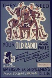 Keywords: They Need Your Old Radio And Parts - NARA - 533886.jpg Scope and content General notes 533886 Local identifier 179-WP-28 Office for Emergency Management War Production Board 01/1942 - 11/03/1945 Still Picture Records Section Special Media Archives Services Division NWCS-S National Archives at College Park 8601 Adelphi Road College Park MD 20740-6001 ca 1942 - ca 1943 Record group Record Group 179 Records of the War Production Board 1918 - 1947 Record group ARC 508 War Production Board compiled 1942 - 1943 Series ARC 533858 File unit File unit ARC Variant control numbers NAIL Control Number NWDNS-179-WP-28 Other versions <gallery> File They_Need_Your_Old_Radio_And_Parts_-_NARA_-_533886 tif tif File They_Need_Your_Old_Radio_And_Parts_-_NARA_-_533886 jpg jpg </gallery> NARA-cooperation PD-USGov World War II posters from the United States Recycling in the United States in World War II |