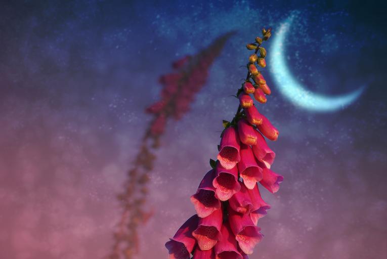 Keywords: thimble flower plant wild flower nature blossom bloom toxic common foxglove medicinal plant purple close pink forest moon photo montage photo composing long
