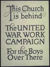 Keywords: "This Church is behind. The United War Work Campaign For The Boys Over There." - NARA - 512696.jpg Scope and content General notes 512696 Local identifier 4-P-258 U S Food Administration Educational Division Advertising Section 01/15/1918 - 01/1919 Still Picture Records Section Special Media Archives Services Division NWCS-S National Archives at College Park 8601 Adelphi Road College Park MD 20740-6001 other date circa 1917 1919 Record group Record Group 4 Records of the U S Food Administration 1917 - 1920 Record group ARC 333 World War I Posters compiled 1917 - 1919 Series ARC 512439 File unit File unit ARC Variant control numbers NAIL Control Number NWDNS-4-P-258 Other versions <gallery> File This_Church_is_behind _The_United_War_Work_Campaign_For_The_Boys_Over_There _-_NARA_-_512696 tif tif File This_Church_is_behind _The_United_War_Work_Campaign_For_The_Boys_Over_There _-_NARA_-_512696 jpg jpg </gallery> NARA-cooperation PD-USGov World War I posters of the United States United States Food Administration |