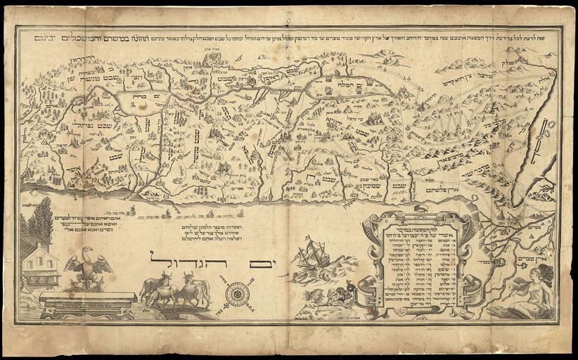 | Keywords: This (is being produced) so that all can know the route of the travels (of the Israelites) 40 years in the desert (through) the width and length of the Holy Land from the Nile to the city of Damascus, WDL2887.png Artwork ru Ав аам Бен-Якоб XVII век fr Abraham ben Jacob 17ème siècle en Abraham ben Jacob 17th century zh 亚伯拉罕· ·雅各布 17 世纪 pt Abraham ben Jacob Século 17 ar ابراهيم بن يعقوب القرن السابع عشر es Abraham ben Yacov siglo XVII ru Ка та создается чтобы все знали ма ш ут блужданий из аильтян в течение 40 лет по пустыне во всех п еделах Святой Земли от ила до го ода Дамаск от долины А нона до С едиземного мо я Здесь каждое колено получило своей надел земли fr Ceci est créé afin que tous puissent connaitre la route des voyages des Israélites 40 ans dans le désert par la largeur et la longueur de la Terre Sainte du Nil à la ville de Damas de la vallée de l'Arnon à la mer Méditerranée et sur elle chaque tribu s'est vue attribuer sa propre portion de terre en This is being produced so that all can know the route of the travels of the Israelites 40 years in the desert through the width and length of the Holy Land from the Nile to the city of Damascus from the Arnon Valley to the Mediterranean Sea and in it each individual tribe was given its own portion of the land zh 图(制 中),出版后 人 能了解(以色列人)40 年 沙漠中的旅行路线,即从尼罗河到大马士 城,从阿尔河谷到 中海(穿越)整个 ,以及每个部落 这片 上拥 的部分 pt Isto está sendo produzido para que todos possam conhecer a rota das viagens dos Israelitas 40 anos no deserto através da largura e da extensão da Terra Santa desde o Nilo até a cidade de Damasco desde o Vale de Arnon até o Mar Mediterrâneo e com isso cada tribo recebeu sua própria porção de terra ar يجري إنتاج هذا لكي يتمكن الجميع من معرفة طريق أسفار الإسرائيليين لمدة 40 سنة في الصحراء عبر عرض وطول الأرض المقدسة من النيل إلى مدينة دمشق، ومن وادي أرنون إلى البحر الأبيض المتوسط، وفيها كان لكل قبيلة جزئها الخاص من الأرض ru Эта медная г авю а Святой Земли 1695 года является одной из самых анних печатных ка т на ив ите Создателем ка ты был п озелит Ав аам Бен-Якоб кото ый положил в основу своей аботы более д евнюю ка ту К истиана ван Ад ихема 1533-1585 гг Его ка та была включена в Амсте дамскую Хаггаду а ка ту нанесены библейские иллюст ации с еди кото ых изоб ажение Ионы в ч еве кита ко абли ца я Соломона везущие кед овый лес для ст оительства х ама в Ие усалиме а также пчелиные улья и ко овы символизи ующие молоко и мед Земли Обетованной Амсте дамская Хаггада пе вая Хаггада включавшая г авю ы на меди п ете пела множество пе еизданий и асп ост анилась по всей Ев опе <br>Библия Ветхий Завет fr Cette gravure sur cuivre de 1695 de la Terre sainte est l'une des toutes premières cartes imprimées en Hébreu La carte fut dessinée par Abraham Ben-Jacob converti au judaïsme sur la base d'une carte précédente par Christiaan van Adrichem 1533-85 et reproduite dans l'Haggadah d'Amsterdam La carte se compose d'illustrations bibliques parmi lesquelles des représentations de l'histoire de Jonas et de la baleine le convoi du Roi Salomon transportant les cèdres pour la construction du temple de Jérusalem et les ruches et les vaches symbolisant le lait et le miel de la Terre promise L'Haggadah d'Amsterdam fut la première Haggadah à inclure des gravures sur cuivre et fut amplement copiée et distribuée à travers toute l'Europe <br>Bible Ancien Testament en This 1695 copperplate engraving of the Holy Land is one of the earliest printed maps in Hebrew The map was drawn by Abraham Ben-Jacob a convert to Judaism based on an earlier map by Christiaan van Adrichem 1533-85 and reproduced in the Amsterdam Haggadah The map features Biblical illustrations among them depictions of the story of Jonah and the whale King Solomon s fleet carrying the cedar trees for the construction of the temple in Jerusalem and beehives and cows symbolizing the milk and honey of the Promised Land The Amsterdam Haggadah was the first Haggadah to include copperplate engravings and was widely copied and distributed throughout Europe <br>Bible Old Testament zh 这幅 1695 年 的 版画是使用希伯 语的 早 印刷 图之 该 图由犹太教信徒亚伯拉罕· -雅各布 绘, 据的是 Christiaan van Adrichem(1533-85 年)早前 绘的 图, 阿姆斯特丹哈加达 中对该 图进行了翻印 该 图包含 经插图,描绘的内容包括约拿和鲸鱼的故事 罗门王运 树(用以建 路撒冷神庙)的船队以及象征乐 中牛奶和 的 箱和奶牛 阿姆斯特丹哈加达 是首部包含 版画的 哈加达 ,该书曾 整个欧洲进行广泛 翻印和传播 <br> 经旧约 pt Esta gravura em placa de cobre da Terra Santa de 1695 é um dos primeiros mapas impressos em hebraico O mapa foi desenhado por Abraham Ben-Jacob um homem convertido ao judaísmo e é baseado em um antigo mapa de Christiaan van Adrichem 1533-85 e reproduzido no Hagadá de Amesterdã O mapa apresenta imagens bíblicas entre e