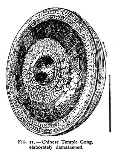 Keywords: THOM Chinese Temple Gong.jpg Fig 11 ” Chinese Temple Gong elaborately damascened From en wikisource The History of Music 1907 Waldo Selden Pratt PD-Old The History of Music PD-Art gongs