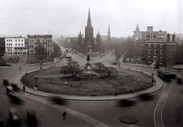 | Keywords: Thomas Circle - Washington, D.C..jpg  Looking north past Thomas Circle in Washington D C as viewed from the Portland Flats demolished; built in 1880 and designed by Adolf Cluss; city's first apartment building The traffic circle is located at the junction of 14th Street visible on the lower right and center left Massachusetts Avenue right and left sides Vermont Avenue lower left and center right and M Street bottom right and bottom left NW The equestrian statue seen in this image was erected in 1879 and honors General George Henry Thomas The streetcar lines wrapping around the Circle on 14th Street were installed in the 1890s but no longer exist The homes visible on either side of the Circle have been demolished National City Christian Church designed by John Russell Pope in 1930 now stands on the Circle's west side and is a contributing property to the Greater Fourteenth Street Historic District The Wylie House seen on the right was demolished in 1947 and replaced with the nine-story Washington Plaza Hotel designed by Morris Lapidus The taller church seen directly across the Circle is Luther Place Memorial Church originally known as Memorial Evangelical Lutheran Church built in 1873 and listed on the National Register of Historic Places A statue honoring Martin Luther is located in front of the church It was a gift from the German emperor in 1884 and is a replica of the Martin Luther statue in Worms Germany Directly behind Luther Place is Mount Olivet Lutheran Church a contributing property to the Logan Circle Historic District The building was constructed in 1884 and originally home to the Vermont Avenue Christian Church original name for the National City Christian Church Mount Olivet purchased the property in 1953 The two remaining landmarks that can be seen in this image include Vermont Avenue Baptist Church look NW on Vermont; the steeple is visible and John Wesley AME Zion Church look north on 14th Street; the steeple is also visible Both buildings are contributing properties to the Greater Fourteenth Street Historic District npcc 30408 1922 National Photo Company PD-USGov Thomas Circle 1922 in Washington D C Martin Luther Statue Washington D C Luther Place Memorial Church Demolished buildings in Washington D C National Register of Historic Places in Washington D C Historic district contributing properties in Washington D C Trams in Washington D C 1920s automobiles George Henry Thomas Memorial 1922 in tram transport Black and white photographs of tram transport |