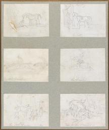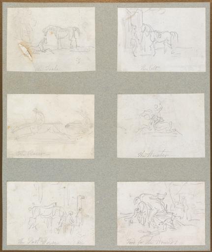 Keywords: Thomas Rowlandson - Ages of the Horse- The Foal, The Colt, The Racer, The Hunter, The Post-Horse, Food for the Hounds - Google Art Project.jpg Inscribed in graphite top left image lower center The Foal ; in graphite top right image lower left The Colt ; in graphite middle left image lower left The Racer ; in graphite middle right image lower center The Hunter ; in graphite bottom left image lower left The Post Horse ; in graphite bottom right image lower left Food for the Hounds Inscription _Signed_and_Dated Not signed not dated Not on View Graphite on medium slightly textured cream laid paper mounted on very thick moderately textured blue wove paper hounds dogs horses animals jockeys sporting art special url_id gAFHVzyXIbcp0w PD-old-100-1923 1827 Drawings and watercolours by Thomas Rowlandson Google Art Project works by Thomas Rowlandson Drawings of horses |