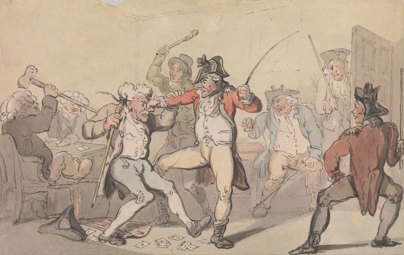 | Keywords: Thomas Rowlandson - A Black Leg Detected Secreting Cards - Google Art Project.jpg Inscribed in graphite verso 287 A underlined; in brown ink verso c cr fingerprints Inscription _Signed_and_Dated Not signed not dated Not on View Watercolor with pen and gray ink on medium smooth cream wove paper fighting riding crops men punching doorway chair chair table hats crutch weapons fist walking sticks genre subject sporting art cards room special url_id IAF9-Q5Rut0Umg PD-old-100-1923 1827 Drawings and watercolours by Thomas Rowlandson Google Art Project works by Thomas Rowlandson |