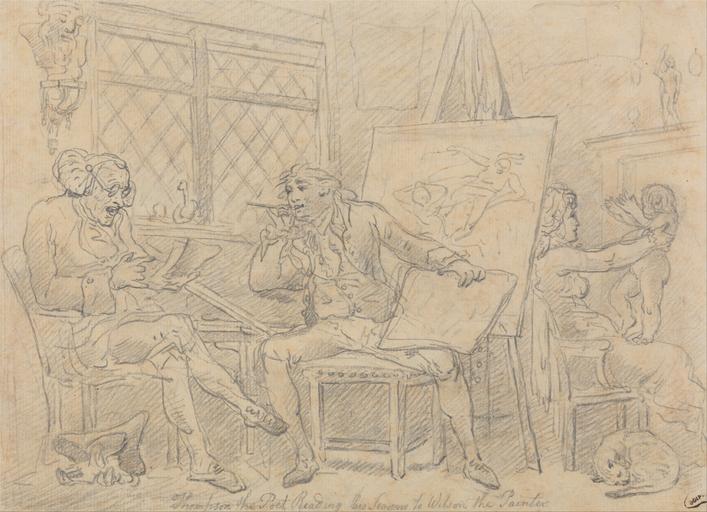 | Keywords: Thomas Rowlandson - The Historian Animating the Mind of the Young Painter - Google Art Project.jpg Inscribed in the artist's hand in graphite lower center Thompson The Poet Reading His Seasons to Wilson the Painter ; in bown ink lower right Scip some of letters lost in stamping process collector's stamp; Verso in brown ink upper center BIXX N ; in brown ink lower right Rowlandson 7 6 Inscription _Marks verso collector's marks unidentified Inscription _Signed_and_Dated Not signed not dated Not on View Graphite on medium moderately textured beige laid paper mounted on thick moderately textured cream wove paper cat domestic cat interior historian writer child men woman window chairs easel hat pen bust genre subject sculpture room painter special url_id AwGzRMZfOQVyHw PD-old-100-1923 1827 Drawings and watercolours by Thomas Rowlandson Google Art Project works by Thomas Rowlandson Painters in art |