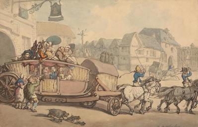 | Keywords: Thomas Rowlandson - The Paris Diligence - Google Art Project.jpg  Inscribed in gray ink lower right T Rowlandson Inscription _Signed_and_Dated Not signed not dated Not on View Watercolor with pen and black gray and red-brown ink over graphite; verso graphite on medium slightly textured beige wove paper ladies riding crops horses animals pig piglets transportation soldiers monks beggars Grand Tour windows archways town buildings carriages cityscape crucifixes special url_id XgE-NZo1_W_K5Q PD-old-100-1923 1827 Drawings and watercolours by Thomas Rowlandson Google Art Project works by Thomas Rowlandson Paris in art Horse-drawn vehicles in Paris |