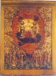 Keywords: Three hypostasis deity (Tsar's workshops, 17 c.).jpeg «Т иипостасное Божество» «П иидите людие т исоставному Божеству поклонимся » Ца ские масте а XVII в Де ево левкас темпе а 128 7х97 2 см Икона иллюст и ует стихе у восьмого гласа звучащую на Великой вече не Пятидесятницы тво ение Льва владыки Текст песнопения помещен на ве хнем поле иконы п ичем даны его начальные и заключительная ст офы «ПРИИДИТЕ ЛЮДИЕ ТРИСОСТАВ О У Б О ЖЕСТВУ ПОКЛО И СЯ С Ы У ВО ОТЦЕ СО С ВЯ ТЫ Д У ХО ОТ Е ЦЪ БО БЕЗЪЛЕТЕ РОДИ С Ы А СОПРИС ОСУЩ А И Д У ХЪ С ВЯ ТЫ БЕ ВО ОТЦЕ СЪ С Ы О ПРОСЛАВЛЯЕ ЕДИ А СИЛА ЕДИ О СУЩЕСТВО ЕДИ О БОЖЕСТВО» иже ст окой мелко «Иже от О т ца исходяй на С ы не почиваяй Т ои це С вя тая слава тебе» В цент е композиции изоб ажены сидящие Господь Саваоф сп ава и Иисус Х истос слева ежду их нимбами в сиянии голубь символ Святого Духа Т иипостасное Божество c еди огненных хе увимов и зеленых се афимов с четы ех сто он символы евангелистов Все остальное п ост анство иконы заполнено фигу ами ангелов ижние п едставлены стоящими на облаках Иллюст ация на текст стихе ы получила ши окое асп ост анение в искусстве се едины XVI в однако более известен д угой ее иконог афический ва иант пятичастная т ех егист овая композиция акценти ующая темы Воплощения Х иста от Святого Духа и а ии Девы сцены «Благовещение» «Рождество Х истово» и «К ещение» в с еднем егист е иконы и поклонение Т иипостасному Божеству фигу ы людей в ее нижнем я усе Схема композиции п едставленной на иконе из Пок овского собо а близка к изоб ажениям на иконах «Литу гия» итало-к итских масте ов конца XVI XVIII вв ихаила Дамаскиноса 1591 г иколая К итянина XVII в и неизвестного иконописца 1704 г а них акценти ован момент п ебывания на небесах Т ех Лиц Святой Т оицы однако добавлены чисто литу гические мотивы шествие ангелов со свечами и ипидами и сцена пе енесения ангелами плащаницы Возможно отсутствие этих сцен на иконе из Пок овского х ама объясняется тем что она написана как па ная к иконе «Да молчит всяка плоть человеча » где п едставлено изоб ажение литу гической п оцессии Икона отличается п евосходной техникой и безуко изненным масте ством исполнения Все детали композиции тщательно выписаны и п о аботаны Особенности письма позволяют отнести икону к п оизведениям ца ских иконописцев В Пивовa ова http //www cirota ru/forum/view php subj 41878 order asc pg 8 XVII в Ца ские масте а Trinity icon co-enthronment Files uploaded by Shakko from various sources PD-Art