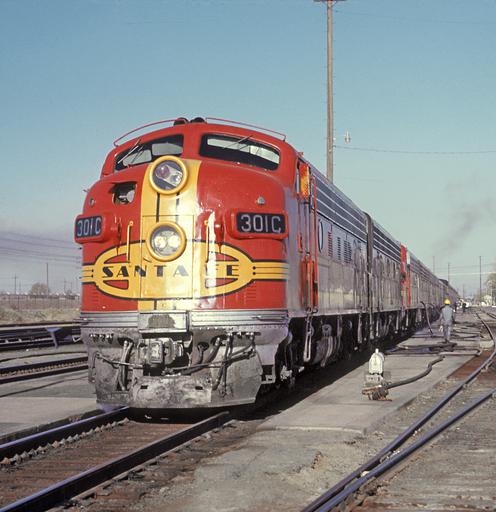 Keywords: at&sf atsf santa fe santafe railroad vehicle train outdoor locomotive ATSF 301C eastbound stopped at the depot in Winslow, AZ in July 1972. Rick Smith on Facebook commented: This sun-facing unit, well illustrates the shop-built Delco-motor driven red-and-clear rotating warning lights peculiar to ATSF F7s and PAs as retrofits. The photo capture of the offset position shows the inward cant of the sealed-beam bulbs mounted on a plate which rotated about a straight-forward projected axis, rendering either a red or a white signal flash as observed from a distance. While the light did not gyrate in the manner as did Pyle or Mars brand signal warning projectors, the "rhythmic" metrical flashing seen from a distance was deemed just as effective. The beam pattern, however, resembled that of Pyle Gyralites, although by opinion not as interesting (or as intriguing) as that of the Mars. ATSF 301C eastbound stopped at the depot in Winslow, AZ in July 1972. Rick Smith on Facebook commented: This sun-facing unit, well illustrates the shop-built Delco-motor driven red-and-clear rotating warning lights peculiar to ATSF F7s and PAs as retrofits. The photo capture of the offset position shows the inward cant of the sealed-beam bulbs mounted on a plate which rotated about a straight-forward projected axis, rendering either a red or a white signal flash as observed from a distance. While the light did not gyrate in the manner as did Pyle or Mars brand signal warning projectors, the "rhythmic" metrical flashing seen from a distance was deemed just as effective. The beam pattern, however, resembled that of Pyle Gyralites, although by opinion not as interesting (or as intriguing) as that of the Mars. |