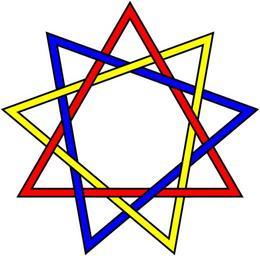 | Keywords: Three-triang-18crossings-Brunnian.svg A three-component Brunnian link which is not the Borromean rings “ no two triangles are directly interlinked but all three are collectively interlinked and cutting any triangle will free the other two For another three-component Brunnian link which is not the same as the Borromean rings see Image Brunnian-3-not-Borromean png A version of this figure is found in the sixth century Marundheeswarar Temple in Thiruvanmayur South Chennai India associated with the goddess Tripurasundari see external page http //www liv ac uk/ 7Espmr02/rings/maths html The three interlaced triangles are a minor symbol in some New Age / occultist / neo-pagan circles presumably with a different preferred color scheme and for such purposes it is occasionally called the star of the muses For a revised version of this image presumably more artistically suited to such symbolic uses see Image Interlaced-Triangles quasi-Arabesque Brunnian-link svg <gallery>File Interlaced-Triangles quasi-Arabesque Brunnian-link svg File Interlaced-Triangles Brunnian-link alternate svg</gallery> This image is an SVG conversion of Image Three-triang-18crossings-Brunnian png generated by means of the following PostScript code <pre> 300 396 translate 2 5 dup scale 5 setlinewidth/x 7500 sqrt -50 moveto 30000 sqrt neg 0 rlineto 7500 sqrt 150 rlineto closepath y def/y gsave 8 setlinewidth 0 setgray stroke grestore stroke def 1 0 0 setrgbcolor x gsave 0 0 1 setrgbcolor 40 rotate x 1 1 0 setrgbcolor 40 rotate x grestore/z gsave 8 setlinewidth 0 setgray 7500 sqrt 35 sub -50 moveto -18 0 rlineto stroke 7500 sqrt 94 sub -50 moveto -21 0 rlineto stroke -69 1025404 -19 6891109 moveto 9 243 sqrt rlineto stroke -39 6025404 31 40638796 moveto 10 5 330 75 sqrt rlineto stroke 17 5 69 6891109 moveto 9 243 sqrt neg rlineto stroke 47 18 59361204 moveto 10 5 330 75 sqrt neg rlineto stroke grestore /q 75 sqrt def/r 3 sqrt def 7500 sqrt 34 sub -50 moveto -20 0 rlineto stroke 7500 sqrt 93 sub -50 moveto -23 0 rlineto stroke -69 1025404 5 sub -19 6891109 q sub moveto 10 243 sqrt r add rlineto stroke -39 6025404 5 sub 31 40638796 q sub moveto 11 5 330 75 sqrt r add rlineto stroke 17 69 6891109 q add moveto 10 243 sqrt r add neg rlineto stroke 46 5 18 59361204 q add moveto 11 5 330 75 sqrt r add neg rlineto stroke def 1 0 0 setrgbcolor z 0 0 1 setrgbcolor 40 rotate z showpage EOF</pre> 2006 Initial upload by Amada44 based on PNG and PostScript vector source by AnonMoos AnonMoos 3 component links Equilateral triangles Decorative knots Brunnian links Nine pointed stars Color permutation of order 3 Blue red yellow Chiral images with rotational symmetry 3-fold rotational symmetry Knots and links on transparent background Alternating knots and links |