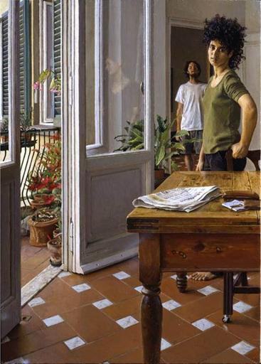Keywords: Three Way Conversation, 2003 . Oil on canvas on panel art-call Artistically