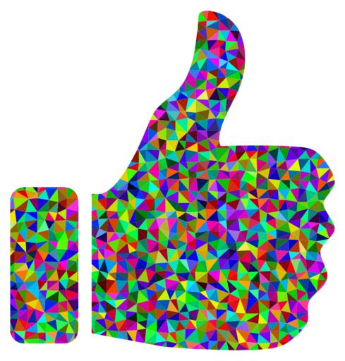 Keywords: thumbs up hand approve like encourage agree condone gesture colorful prismatic chromatic rainbow triangles triangular low poly polygon abstract geometric art vector svg