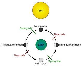 Keywords: Tide schematic.svg en Tides schematic Due to the bathymetry of some areas neap and spring tides reach their maximum force 2 days after the first quarter moon third quarter moon and new moon full moon respectively In the absence of complications due to bathymetry spring tides are exactly at the full and new moons and neap tides are exactly at the one-quarter and three-quarter moon Every six hours the water also lowers or heightens; as such four tides are created Low water spring tide<br/> High water spring tide<br/> Low water neap tide<br/> High water neap tide 2009-10-06 Public domain image File Tides schematic JPG which was based on an image in Leidraad voor het Stuurbrevet by Richard Vooren Paul Van den Keybus User KVDP SVG conversion by Surachit Other versions <gallery> Esquema-mareas svg language es Tide schematic de svg language de Tide schematic mk svg language mk </gallery> Original jpg drawing File Tides schematic JPG Other fields + Diagrams Tides Tides |