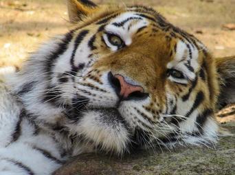 Keywords: tiger head cat close eyes tired rest zoo relaxation