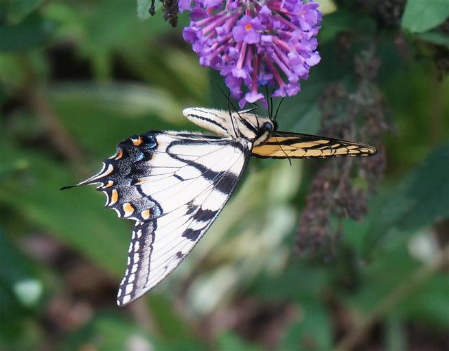 Keywords: tiger swallowtail upside-down butterfly bush butterfly insect animal flower blossom bloom garden shrub nature winged yellow purple eastern natural flora fauna wild
