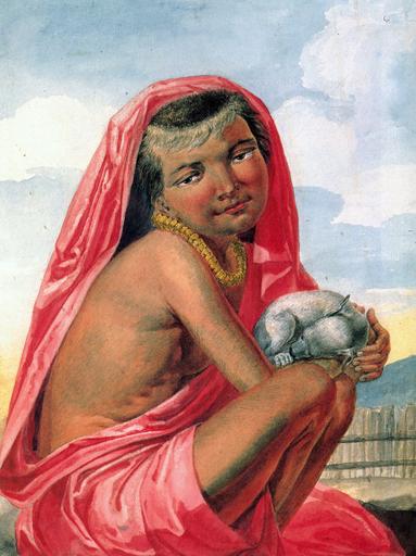 | Keywords: Tikhanov - Young Girl of the Sandwich Islands (1818).jpg  en Young Girl of the Sandwich Islands Portrait by Russian artist Mikhail Tikhanov in 1818 Watercolor over pencil 18 1/4 X 13 1/16 in 46 4 X 33 2 cm Scientific Research Museum of the USSR Academy of Arts Saint Petersburg Done when the frigate Kamchatka was in Honolulu In the hand of the girl is possibly a Hawaiian Poi Dog which went extinct in the 19th-century <blockquote>The porpriat of a young Hawaiian girl and her pet dog is perhaps Tikhanov's most appealing watercolor The girl is shown crouching her knees drawn up and her feet neatly tucked under as if arranged to fit the confines of the page She turns her head to face outward at a slightly awkward angle but she seems at ease absorbed in her own thoughts Her small dog rests on her knees curled up The young girl wears about her waist a pink pāʻū skirt of the finest and softest manufacture Her matching kihei or wrapper is thrown across her left shoulder over head and down her back An additional detail of the girl's costume is the lei of hala' fruit segments perhaps worn as a sign of mourning for the recent death of Kamehameha I's sister The identity of the girl is unknown but she must have been of high status because of her elegant consume and band of lime-bleached hair a dressing much in vogue at the time among women of royal rank </blockquote> cite book Forbes David W Encounters with Paradise Views of Hawaii and Its People 1778-1941 1992 Honolulu Honolulu Academy of Arts 978-0-7103-0454-4 24550242 68 creator Mikhail Tikhanov 1818-10 Mikhail Tikhanov 1818 paintings from Russia Dogs of Hawaii Hawaii in the 1810s Native Hawaiians in art Paintings of girls with dogs Kihei garment PD-old-100  |