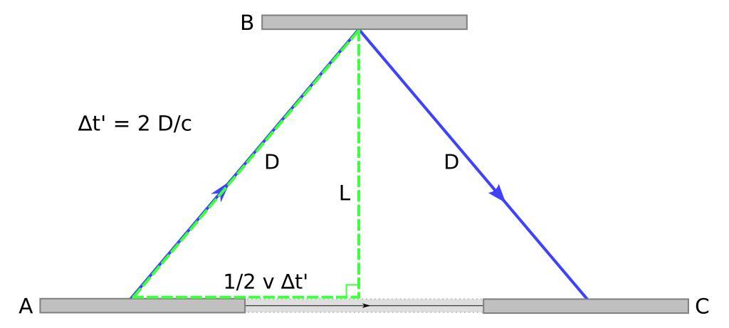 | Keywords: Time-dilation-002.svg The clock as observed in a frame where it is moving at some speed 'v' In this case the photon traces out a triangular path which is longer than in the rest frame But since the speed of light is the same in all frames this necessarily leads to a lengthening of the period of the clock as derived in the image SVG version of the original Image Time-dilation-002 jpg en wikipedia Hansmuller 2006 01 13 first version ; 2007 12 31 last version Mdd4696 wikipedia en Mdd4696 Original upload log page en wikipedia Time-dilation-002 svg 2007-12-31 11 07 DVdm 1000×450× 18513 bytes <nowiki>Correction</nowiki> 2007-12-31 11 05 DVdm 1000×450× 18513 bytes <nowiki>Delta notation to conform with rest of article and to avoid confusion with twin picture</nowiki> 2006-01-13 03 05 Mdd4696 1000×450× 17204 bytes <nowiki>Swapped A and B</nowiki> 2006-01-13 02 32 Mdd4696 1000×450× 17204 bytes <nowiki>The clock as observed in a frame where it is moving at some speed 'v' In this case the photon traces out a triangular path which is longer than in the rest frame But since the speed of light is the same in all frames this necessarily leads to</nowiki> Special relativity |