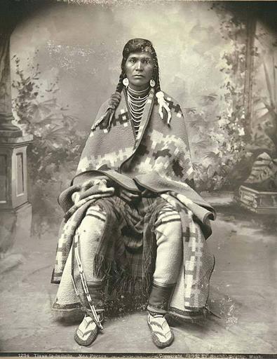 | Keywords: Tipya-la-lwilpilp, Nez Perce Indian, Washington, 1899 (LAROCHE 81).jpeg Photograph Creator Frank La Roche Caption on image Tipya-la-lwilpilp Nez Perces Studio portrait of a Nez Perce man called Tipya-la-lwilpilp He is seated with a blanket around his shoulders with shell earrings and beaded necklaces and moccasins and there is fur wrapped around the ends of his braids He is posed in front of a painted backdrop of an arbor Subjects LCSH Tipya-la-lwilpilp; Portraits--Washington State ; Nez Perce Indians--Clothing dress depicted place Washington state 1899 Institution University of Washington UWASH-LAROCHE-source accession number laroche 81 PD-old-auto-1923 1936 Information field Order Number LAR125 Nez Perce 19th-century portrait photographs of sitting men at full length 1899 in Washington state Moccasins |