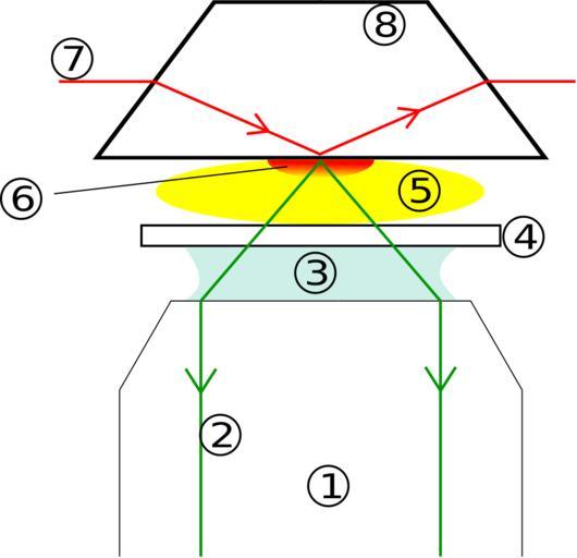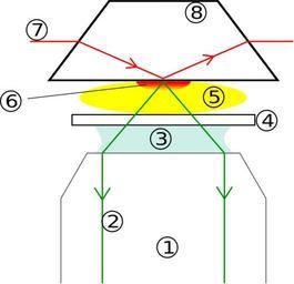 MAKE A MEME View Large Image TIRFM2.svg Total Internal Reflection Fluorescence Microscope trans- TIRFM diagram Objective Emission beam signal Immersion oil Cover slip Specimen Evanescent wave range Excitation beam Quartz prism Schemat zasady TIRFM w systemie trans- ...