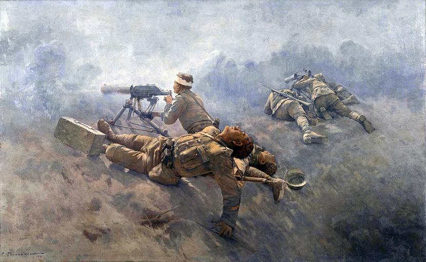 | Keywords: To the Last Man Prokopiou.jpg el έχρις Εσχάτων 1921 Γέώργιος Προκο ίου Συλλογή Εθνικής Τρά εζας της Ελλάδας Εικονίζονται Έλληνες Στρατιώτες κατά τις ε ιχειρήσεις της ικράς Ασίας το 1921 en To the Last Man έχρις Εσχάτων 1921 Georgios Prokopiou Gallery of the National Bank of Greece The painting depicts Greek infantrymen in Asia Minor 1921 during the Greco-Turkish War 2014-01-12 01 47 23 http //www gprokopiou gr/images/gallery/ETHNIKI-TRAPEZA-PROKOPIOU_MEXRIS-ESXATON jpg Creator Georgios Prokopiou PD-Art Uploaded with UploadWizard Greco-Turkish War 1919 1922 20th-century paintings Georgios Prokopiou People with machine guns |