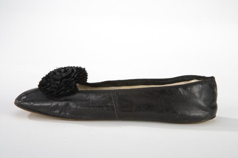 Keywords: Tofflor tillhörande Desideria - Livrustkammaren - 15474.tif Pumps av svart getskinn chevrå Skon har rak läst ingen klack och i det närmaste tvär tå Skon är skuren i ovanläder och bakstycke som förenas med dubbla sidsömmar Ovanlädret fodrat med beiget linnefoder och bakstycket med benvitt getskinn Innersulan klädd med benvitt getskinn Ringningen är skodd med ettkantband av svart sidenrips Mitt fram är skon dekorerad med en svart rosett av sidenband bredd 430 mm höjd 55 mm Yttersula gjord av ljusbrunt nötläder I hålfoten finns en tillverkarstämpel under kunglig krona MAYER under Julien under A PARIS På yttersulan i höger tåparti varmstämplat 56 under 5 original caption Tofflor tillhörande Desideria LRK 17540 <br/> Nyckelord Toffel Svart Skorosor Skinn Föremålsbild Skor ger mer decade other date - 1820 1830 hide Färg svart material skinn - silk Färg svart material siden - linen Färg beige material linne - goatskin Färg benvit material getskinn g 55 size mm 240 57 51 LRK Desideria av Sverige-Norge Skor ger mer - makt flärd magi 2007 MAYER A PARIS Mayer MAYER A PARIS Mayer place of origin original filename lm_dig2326_17540 54135 inventory number LRK 17540 15474 CC-BY-SA Göran Schmidt <gallery caption Different images of same object > File Tofflor tillhörande Desideria - Livrustkammaren - 6914 tif </gallery> Göran Schmidt Black Accessories for shoes Footwear in Livrustkammaren Shoes on white background Media contributed by LSH unmatched material Media contributed by LSH unmatched creator Media contributed by LSH unmatched keyword Color images from Livrustkammaren Media contributed by LSH 2013-10